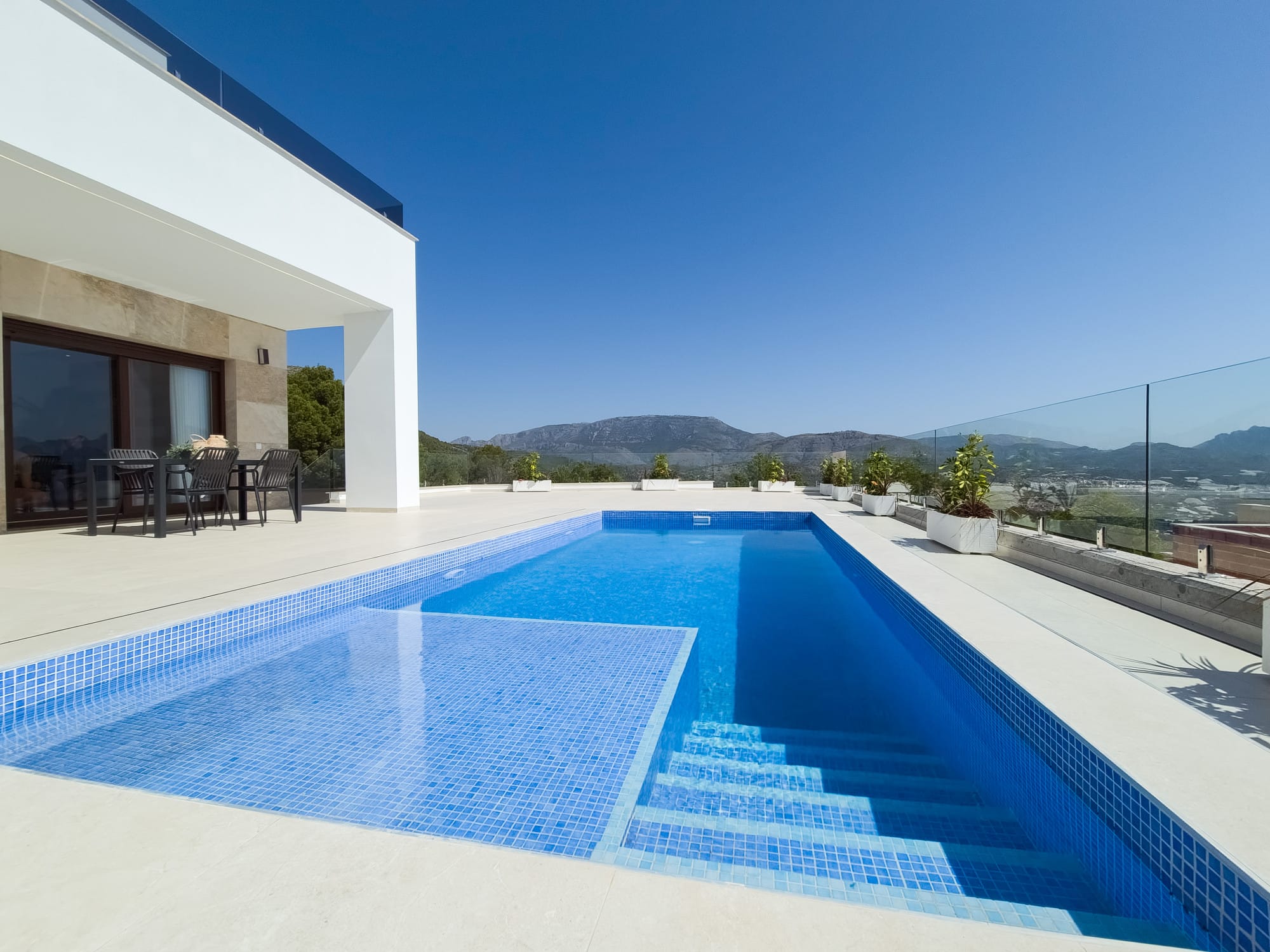 Prezentujemy na sprzedaż nowoczesną wille o powierzchni 130m2 położoną w Hiszpanii w miasteczku Polop. Dom składa się z 3 sypialni z prywatnymi łazienkami, salonu z wyjściem na taras, w pełni wyposażonej kuchni, garażu oraz prywatnego basenu. Willa posadowiona jest na działce o powierzchni 400m2 z pięknie zaaranżowanym ogrodem, z którego rozpościera się niebywały widok na zatokę i góry.