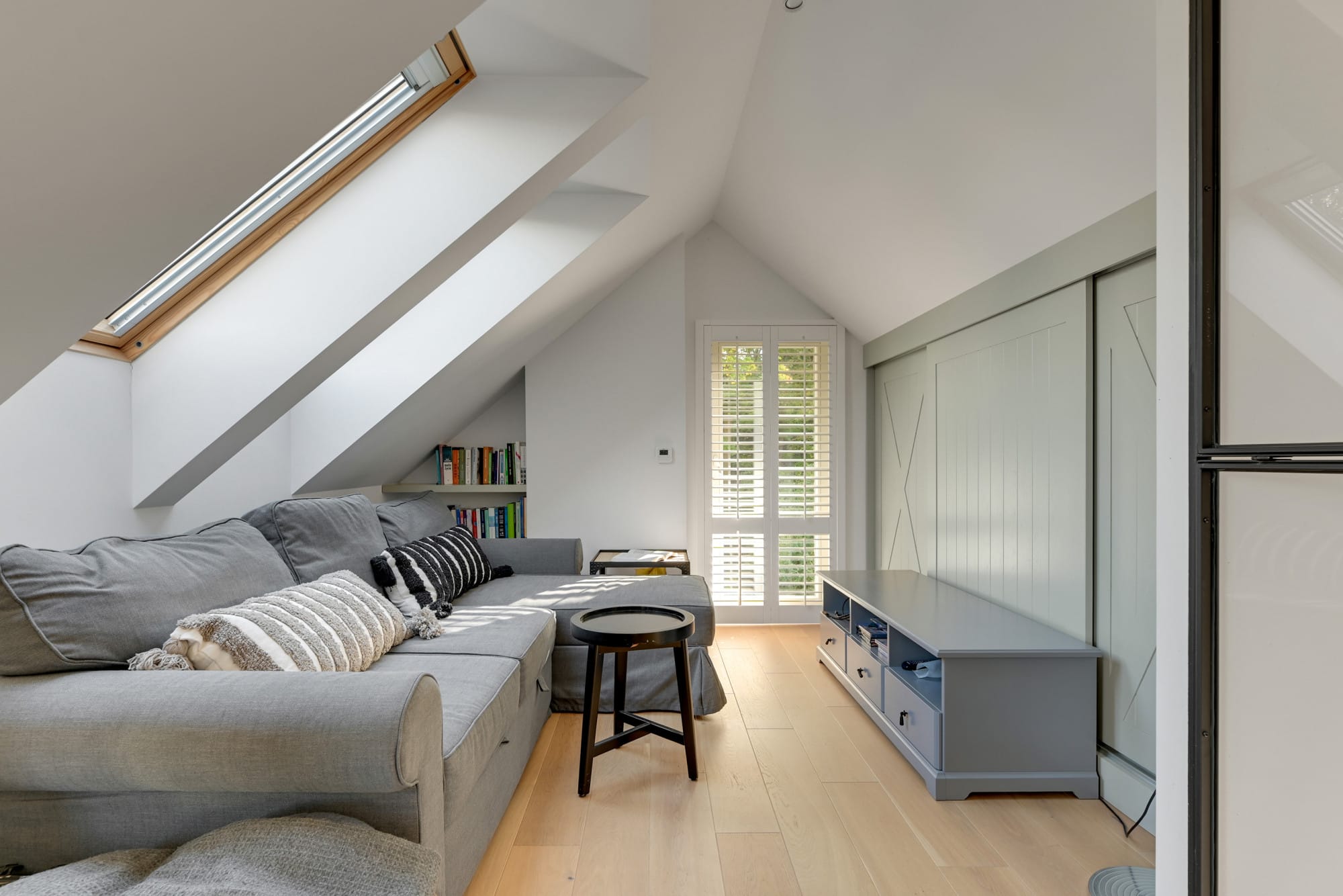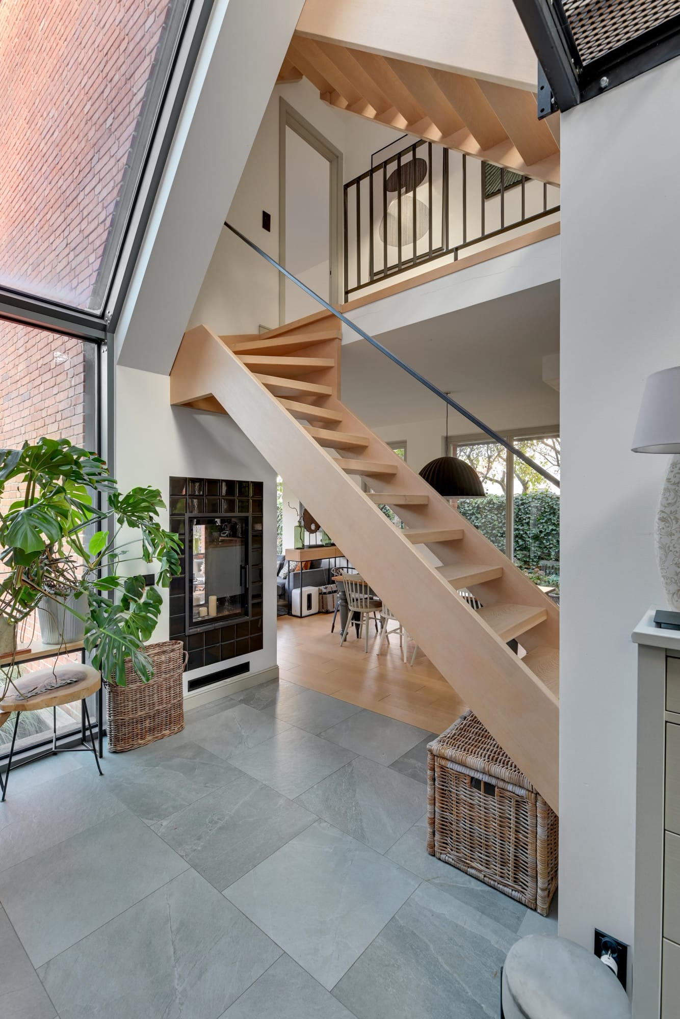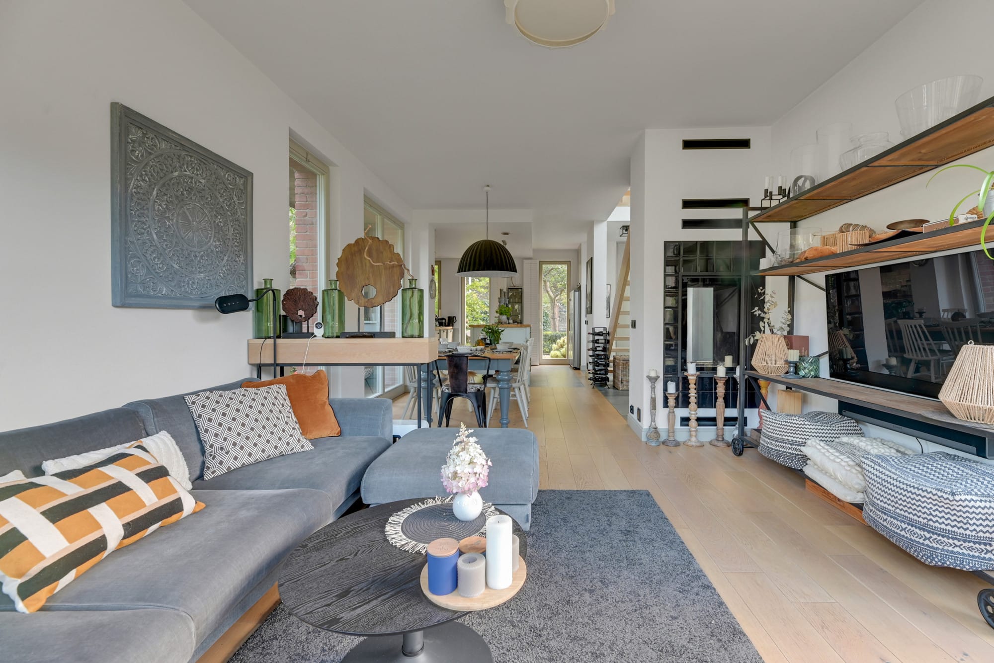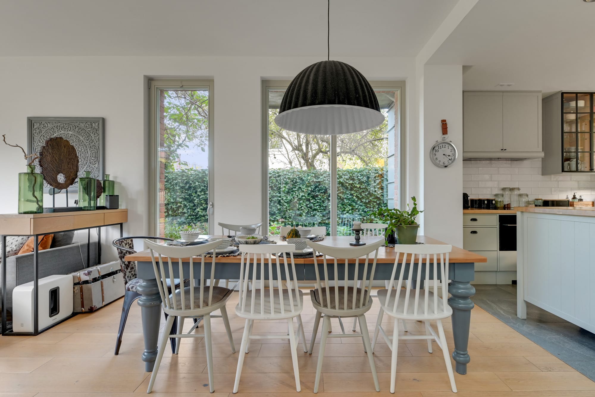 Serce domu stanowi przestronny salon z wyjściem na ogród, który płynnie łączy się z kuchnią oraz jadalnią. Otwarta, jasna przestrzeń sprzyja wspólnemu spędzaniu czasu i tworzy idealne miejsce zarówno do codziennego życia, jak i przyjmowania gości.