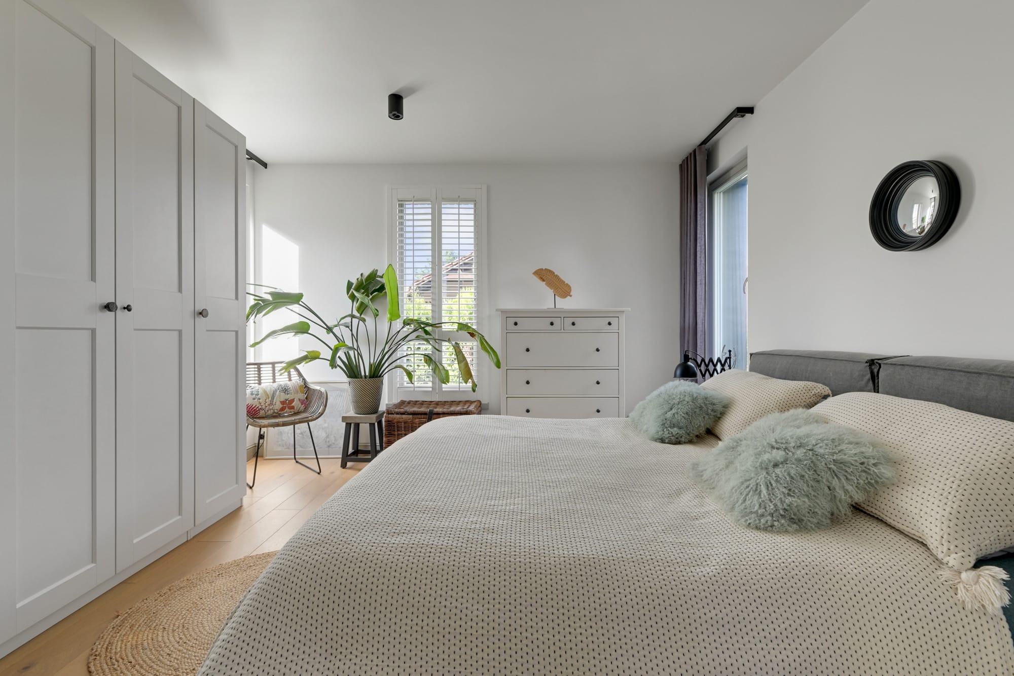 Na piętrze znajdują się trzy komfortowe sypialnie, w tym elegancka sypialnia master z prywatną łazienką. Układ domu pozwala również na łatwe wydzielenie czwartej sypialni lub gabinetu, dostosowując przestrzeń do potrzeb mieszkańców.