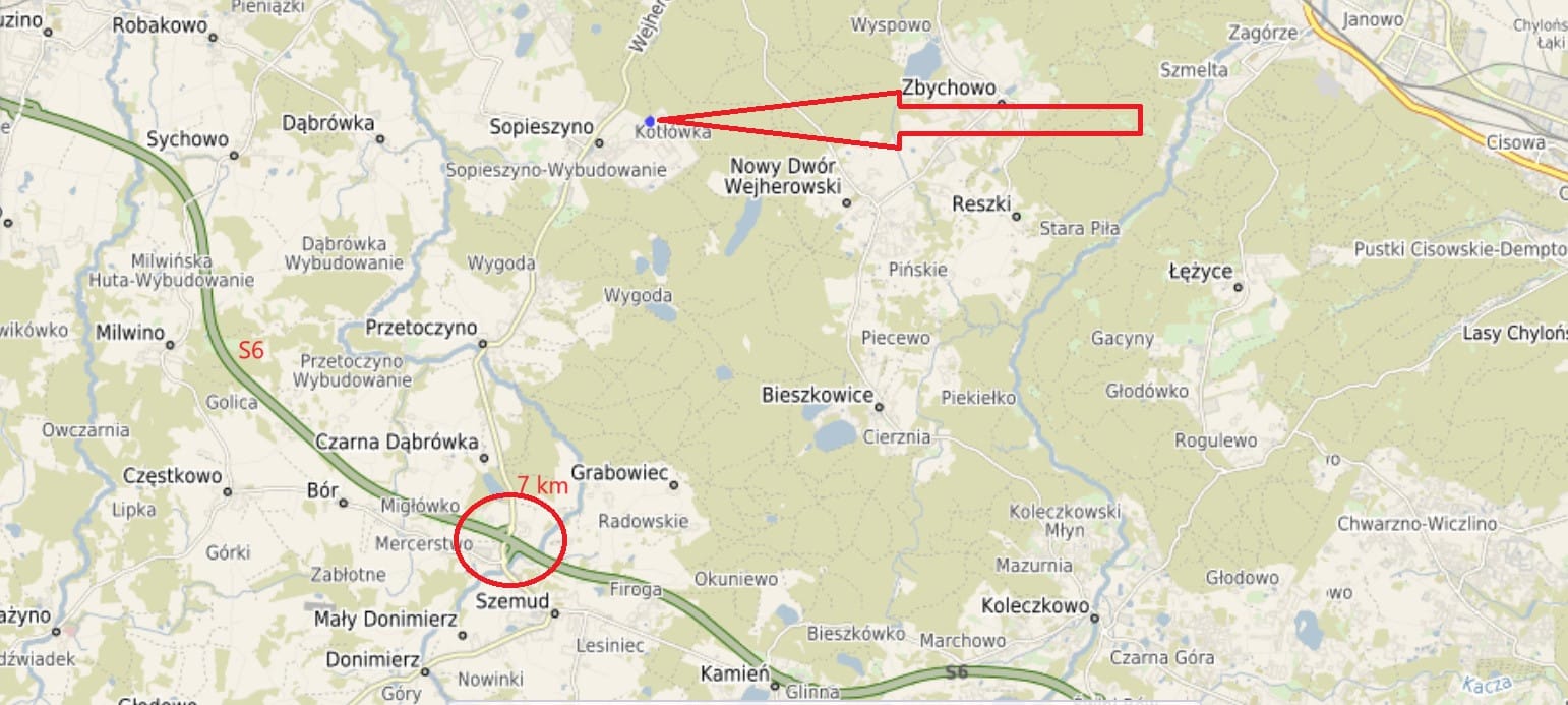 – 7 km do węzła Szemud drogi S-6