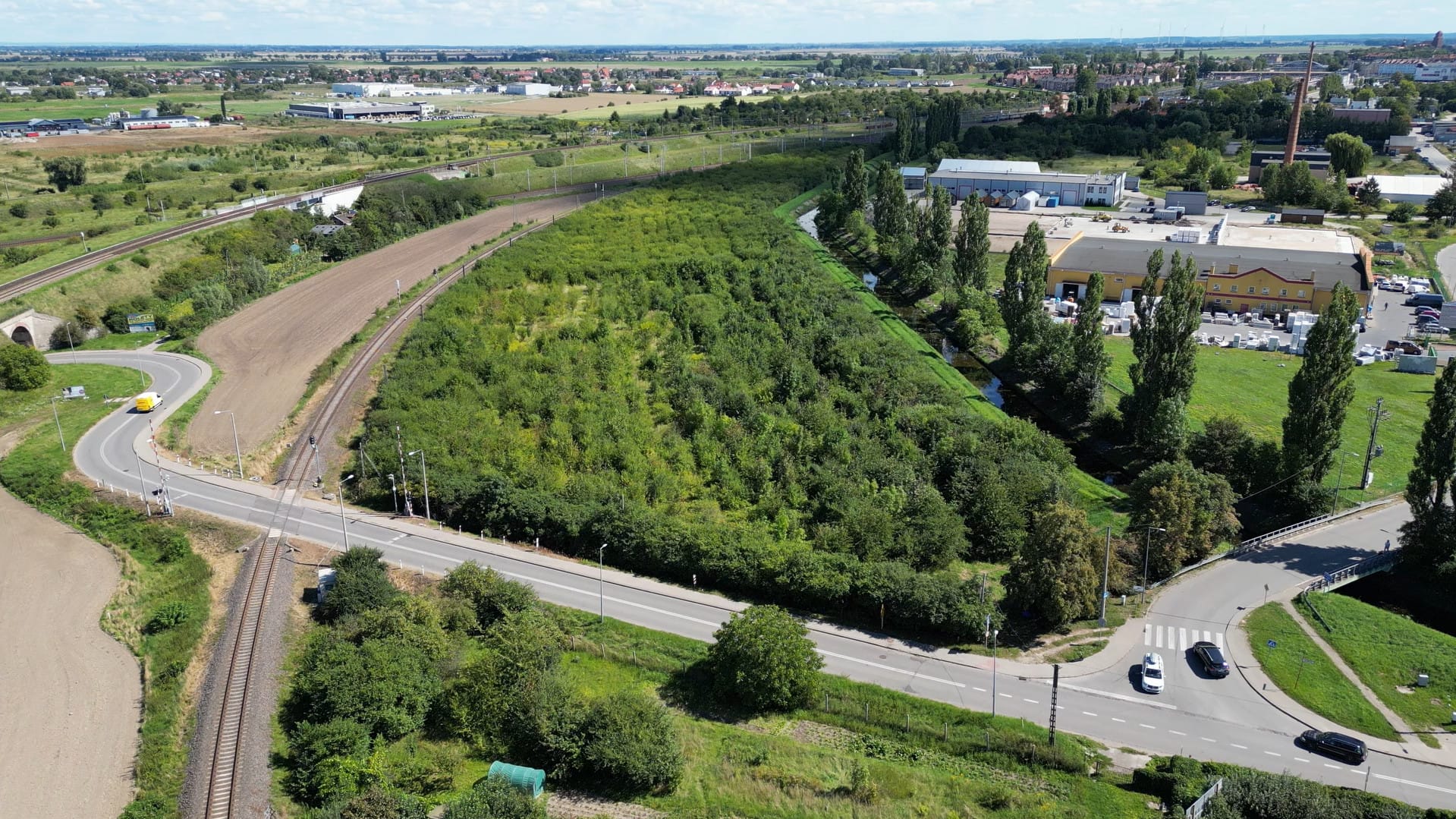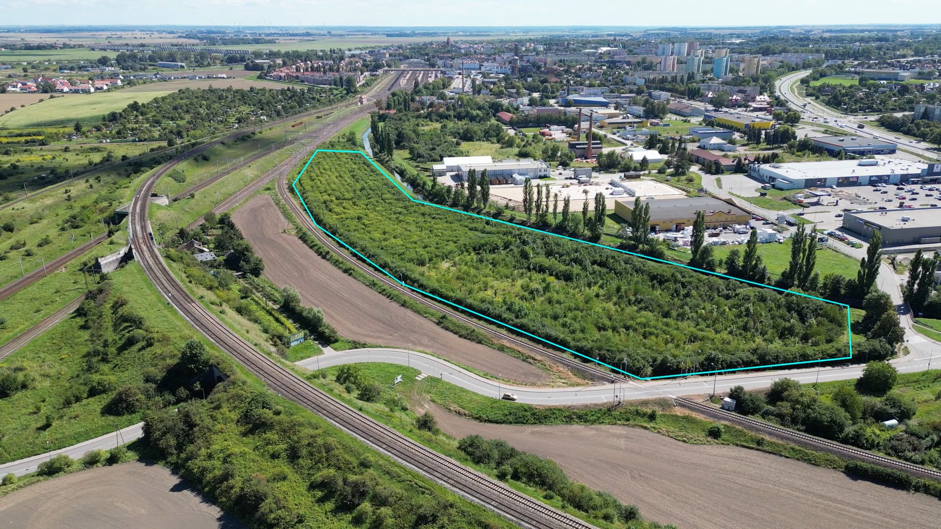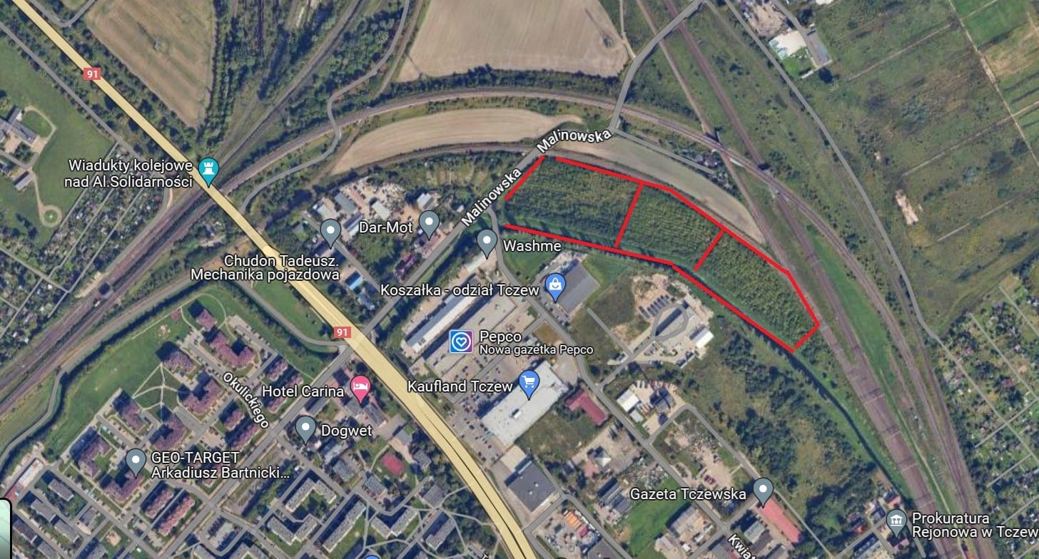 TakTeren z Planem Miejscowym pod Przemysł, Tczew działka pomiędzy linią kolejową a terenem zabudowanym Parkiem handlowym i składem budowlanym.