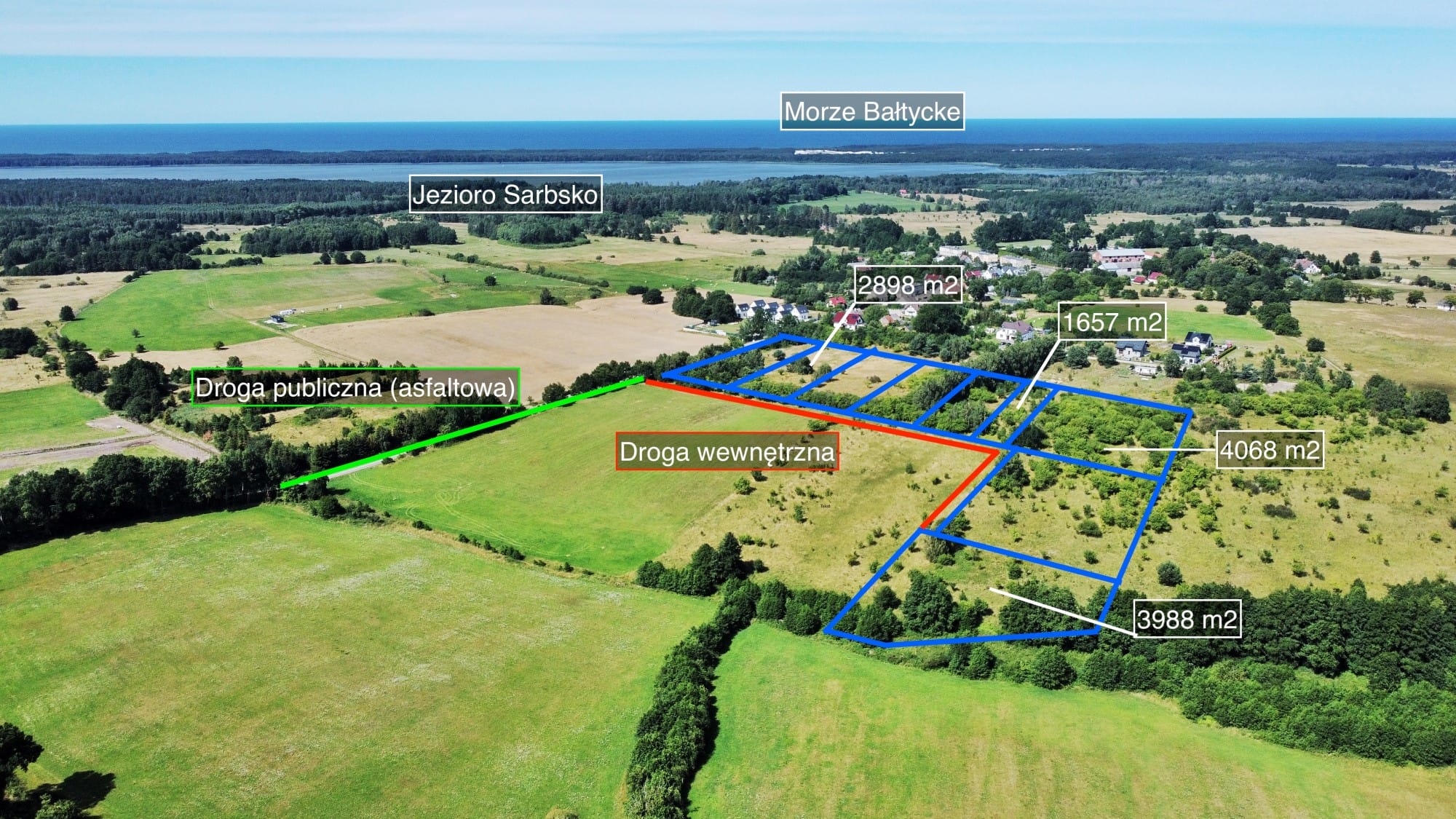 Działka o powierzchni 3988 m2 (wymiary: pole czworokąta o bokach różnej wielkości: 70, 67, 40, 78 m) Najbliższe Jeziora Sarbsko w odległości tylko ok. 1 km a do plaży nad morzem jest ok. 6 km.