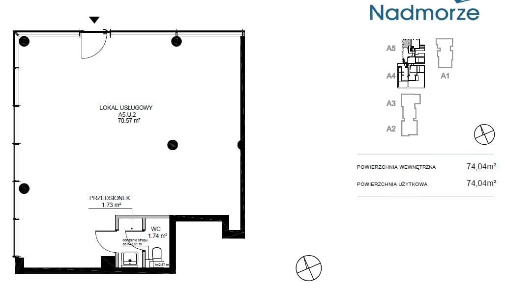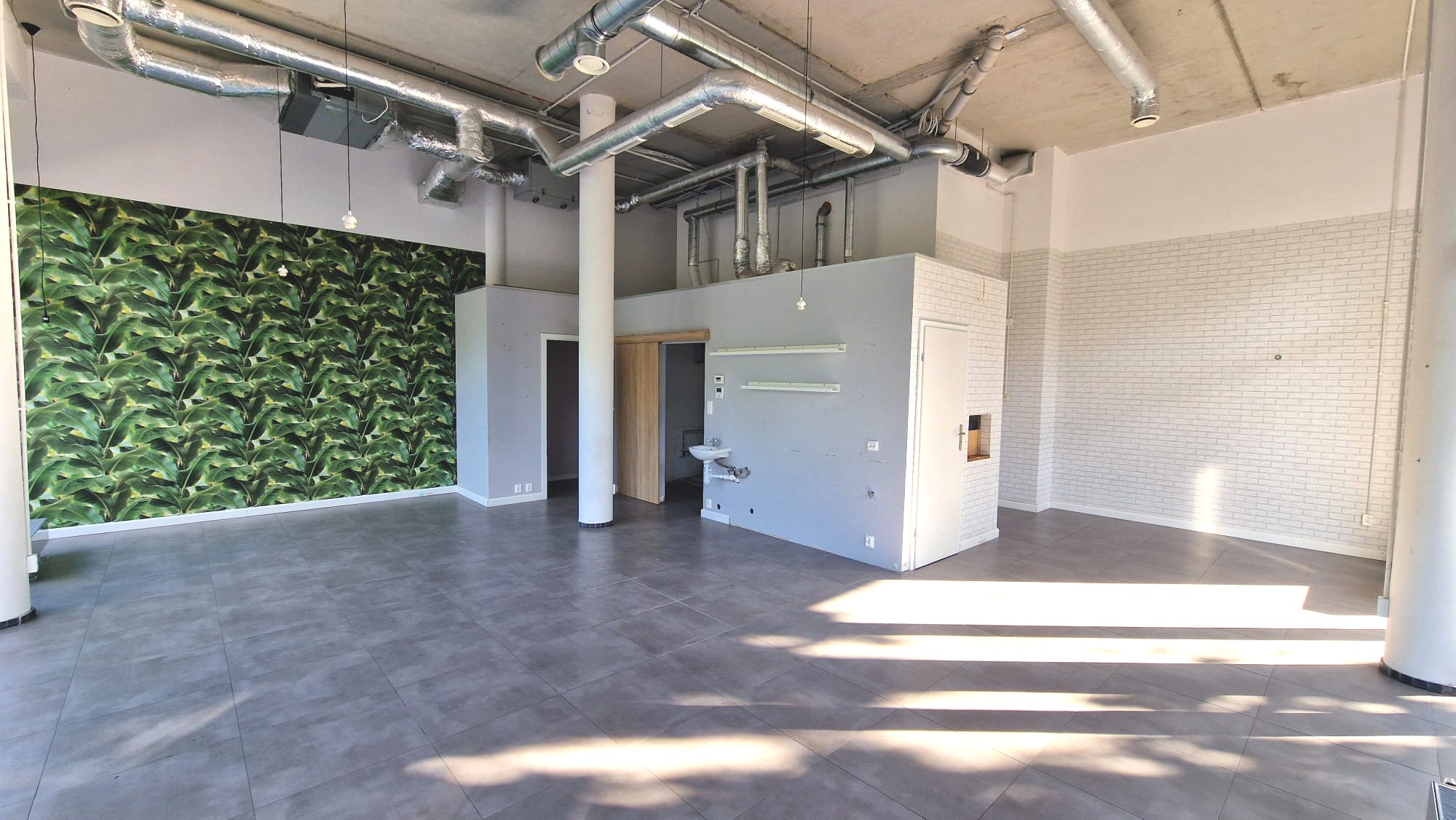 Lokal znajduje się w pasie punków usługowych i gastronomicznych. Lokalizacja jest elegancka i nadaje się na każdą, nawet najbardziej ekskluzywną działalność. Pomieszczenie 74 m2, z wydzieloną częścią sanitarną (3,5m2) i niewielkim zapleczem. Przeszklenia od ziemi do sufitu na dwóch narożnych ścianach lokalu, powodują doskonałe doświetlenie wnętrza. Wysokość od posadzki do stropu 4 m. Przed Lokalem możliwość wykorzystania części wspólnych na potrzeby działalności najemcy, np. sezonowy ogródek gastronomiczny. W górnej części witryn znajduje się powierzchnia dedykowana na umieszczenie podświetlanego oznakowania (logo) działalności najemcy (jest gotowy kaseton z oświetleniem LED)