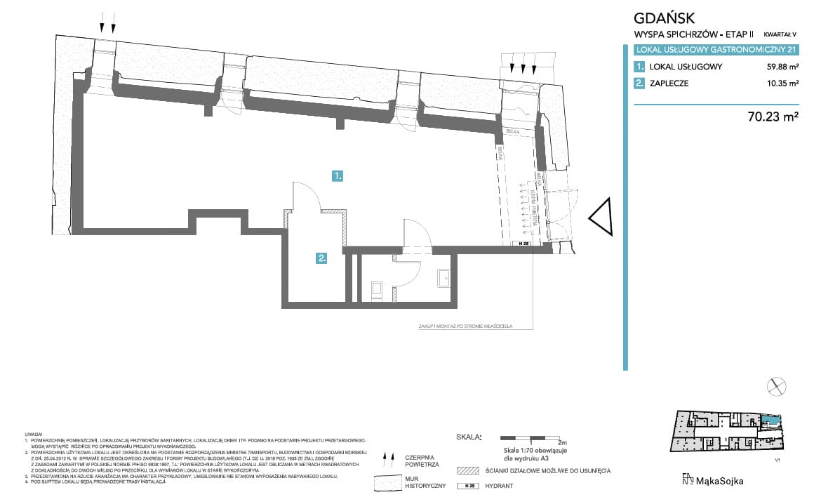 TakNa wynajem lokal gastronomiczny w stanie deweloperskim o powierzchni niecałych 76 m2, zlokalizowany na parterze w prestiżowej inwestycji Granaria na Wyspie Spichrzów.
