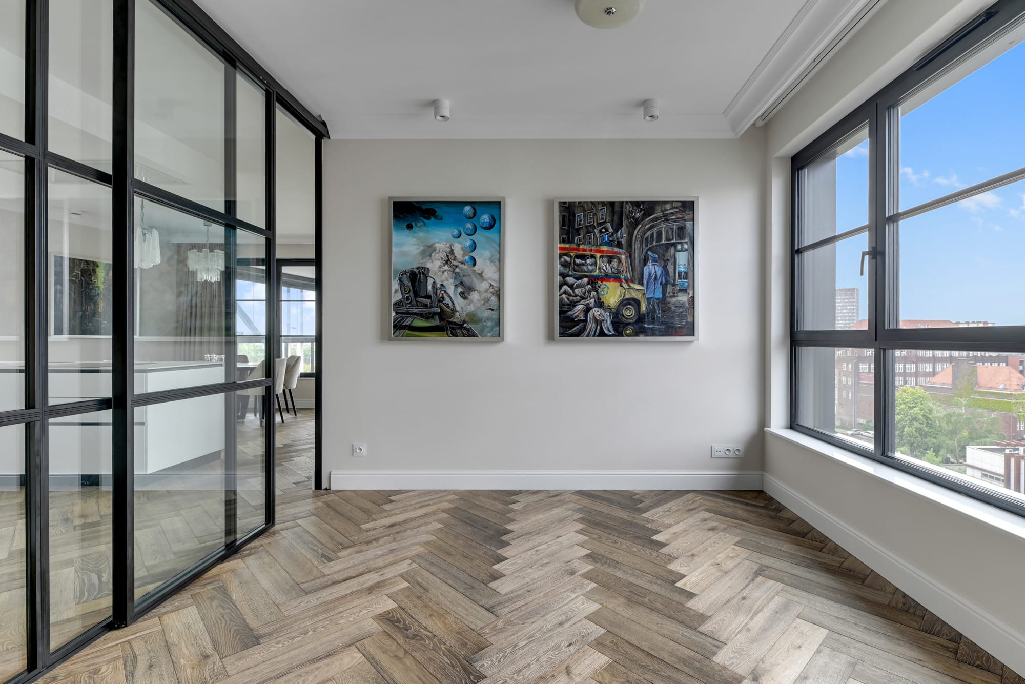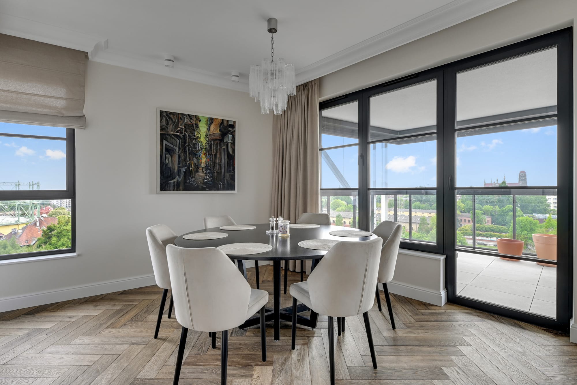 Z salonu wyjście na taras, z którego rozprzestrzenia się obłędny widok na miasto. Taras posiada konstrukcję ruchomych przeszkleń, dzięki czemu może być przestrzenią otwartą lub ogrodem zimowym.