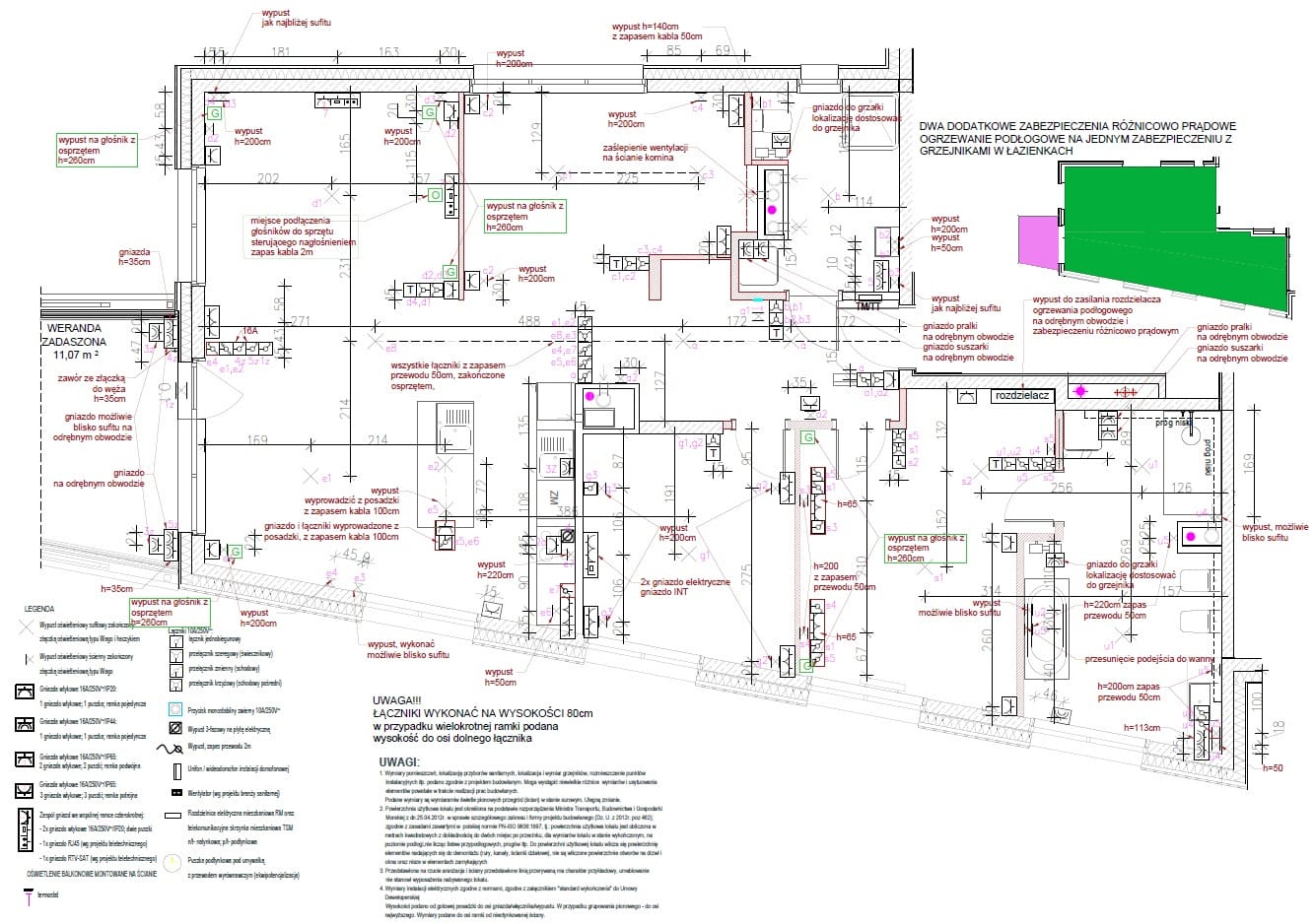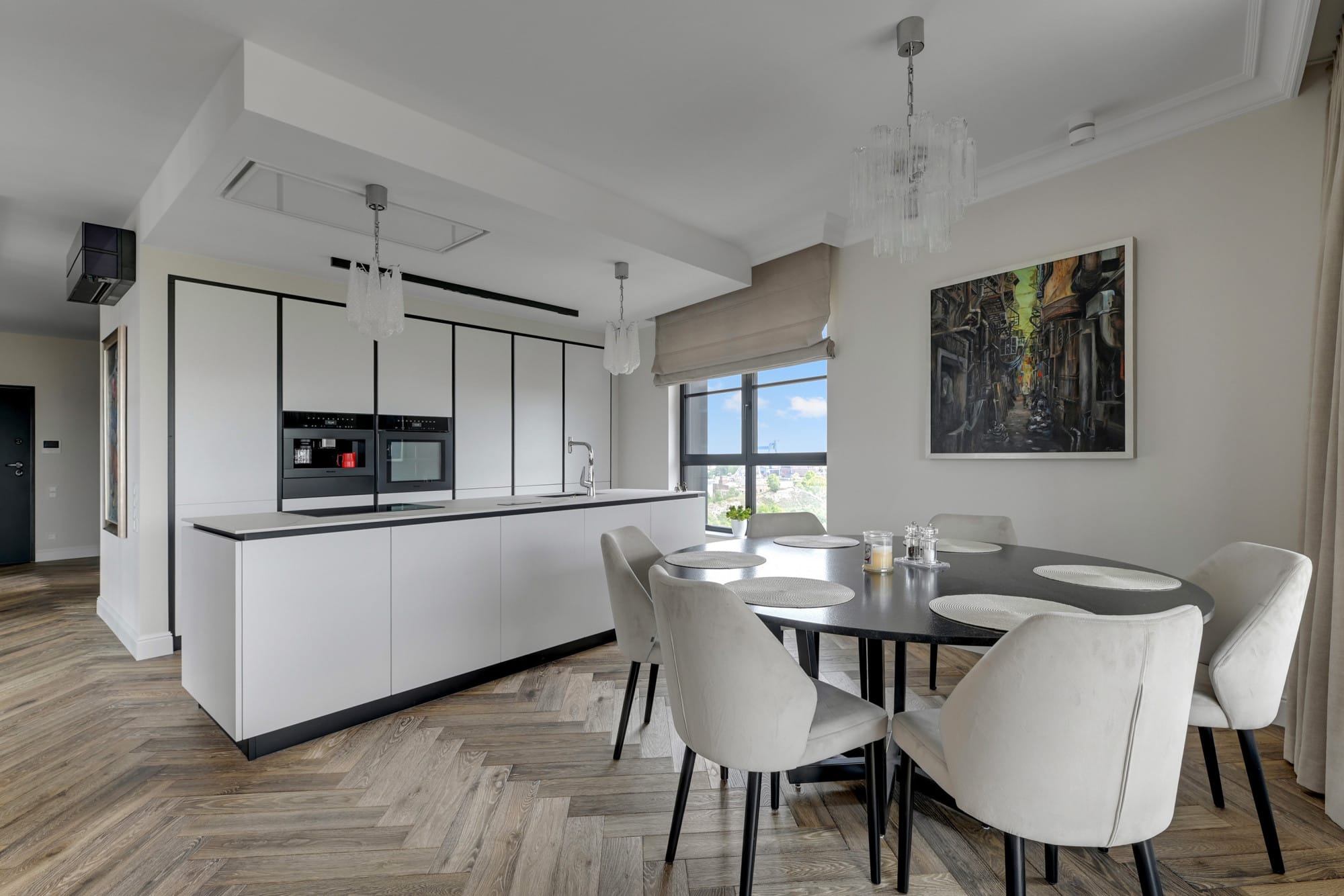 W całym apartamencie zastosowano ogrzewanie podłogowe unikając dzięki temu wiszących grzejników ściennych. Rolety zasuwane elektrycznie, w mieszkaniu klimatyzacja.