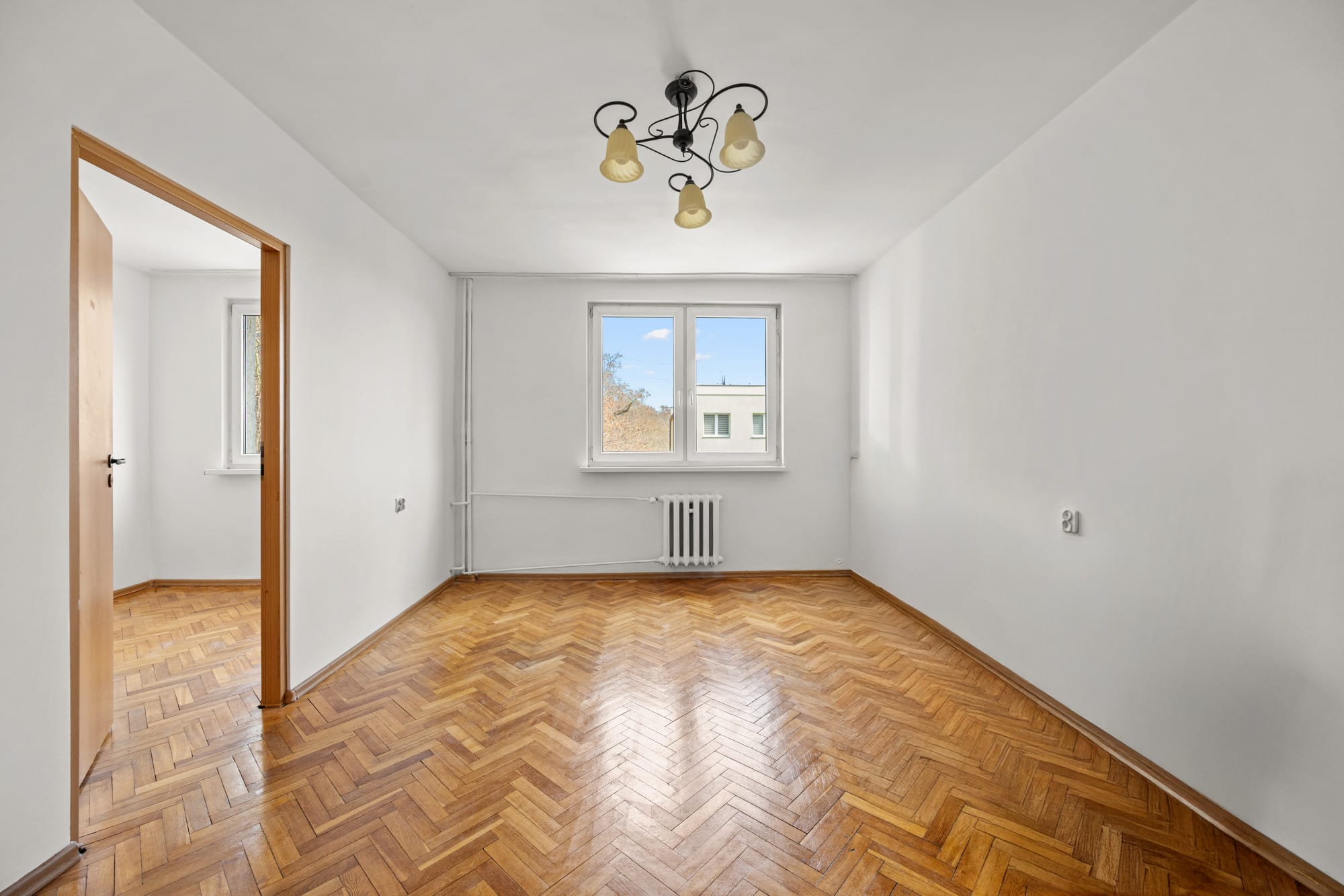 Mieszkanie jest bardzo ciepłe, opróżnione i gotowe do wydania. Choć wymaga odświeżenia lub remontu, jego stan pozwala na zamieszkanie bez natychmiastowych, dużych nakładów. Atutem wnętrza jest zachowany dębowy parkiet (klasyczna jodełka), który po wycyklinowaniu nada wnętrzu wyjątkowego charakteru.