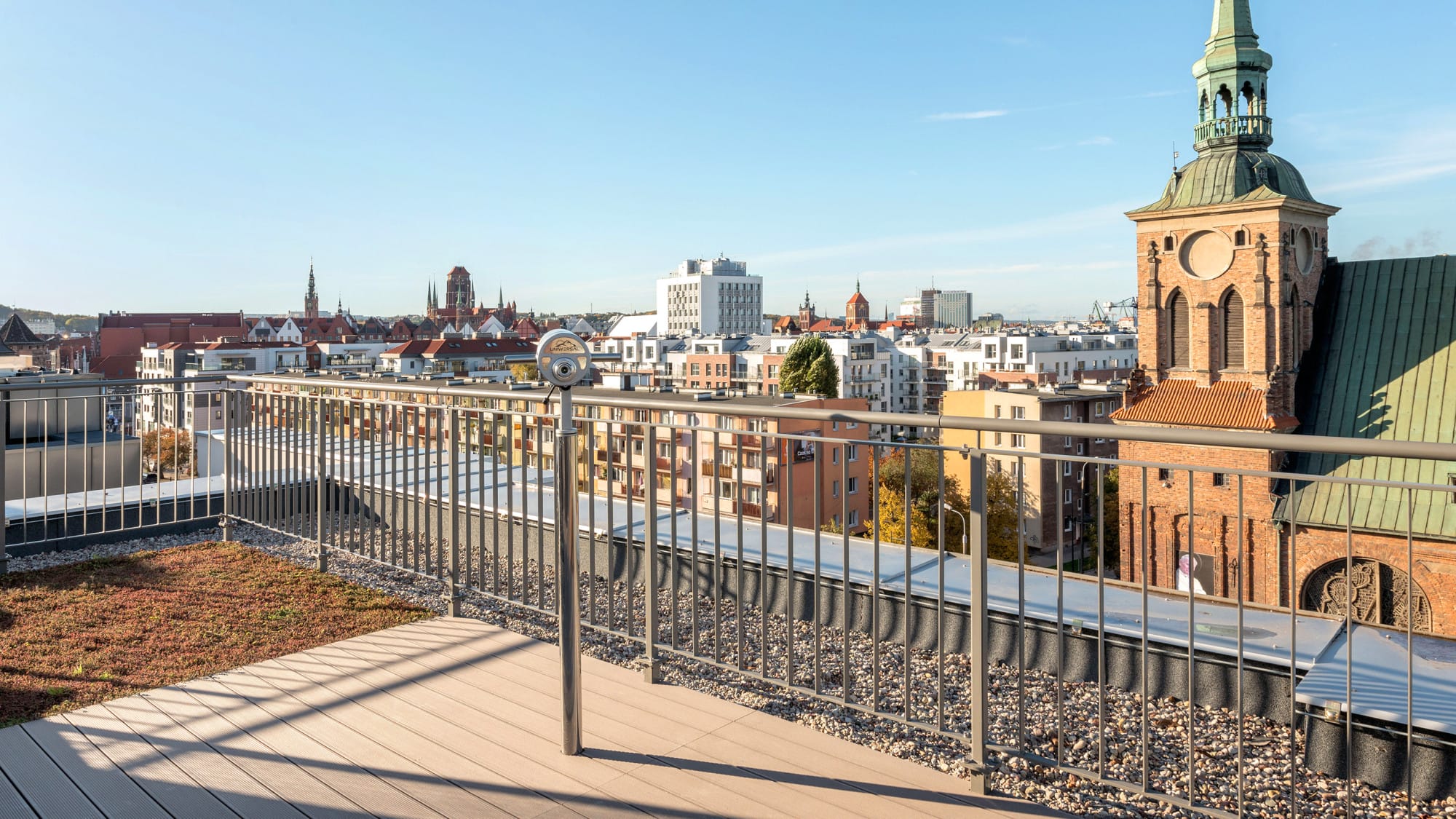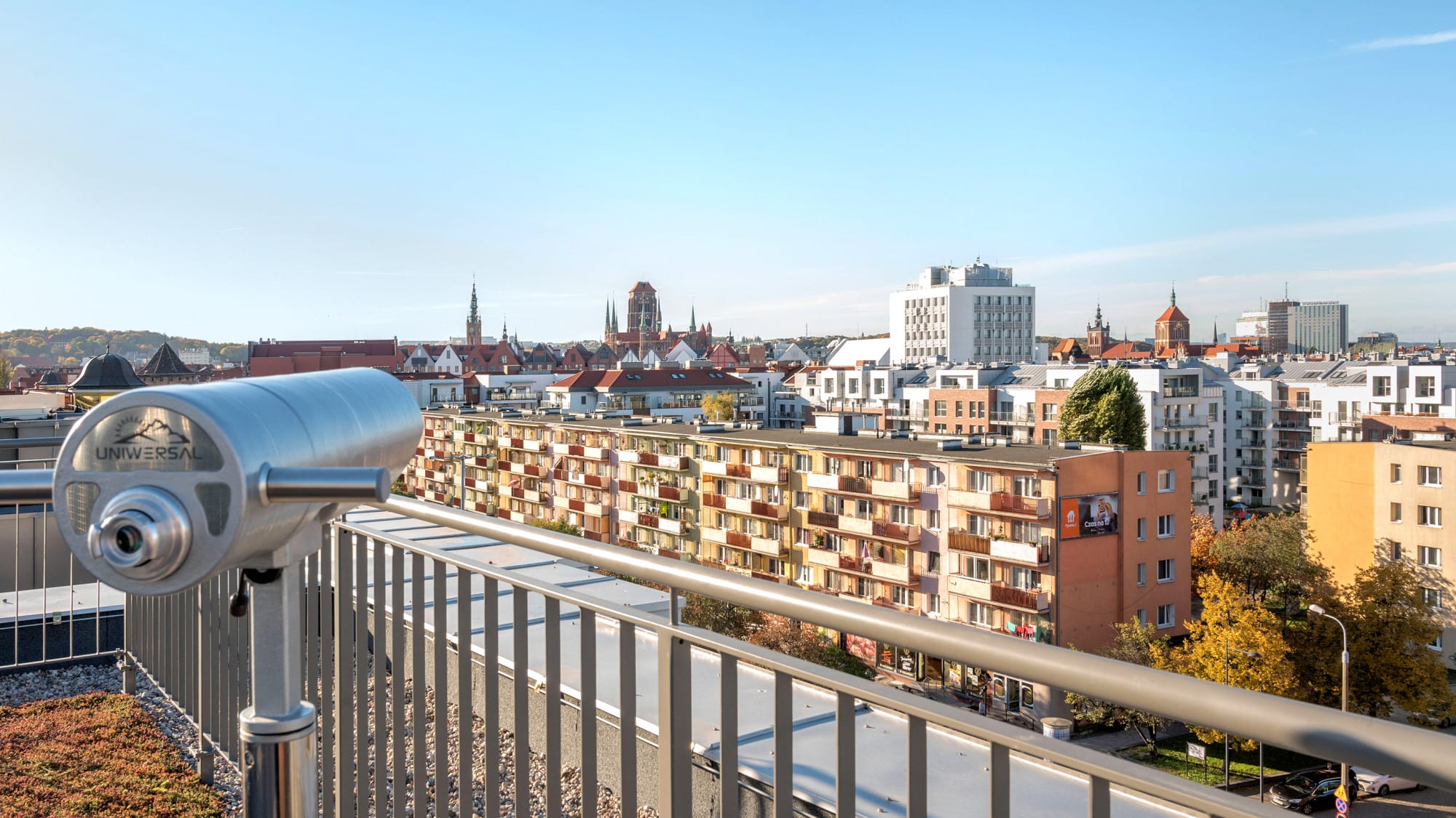 • Spektakularny taras widokowy na dachu budynku, z którego roztacza się panorama Starego Miasta, Motławy i Wyspy Spichrzów.