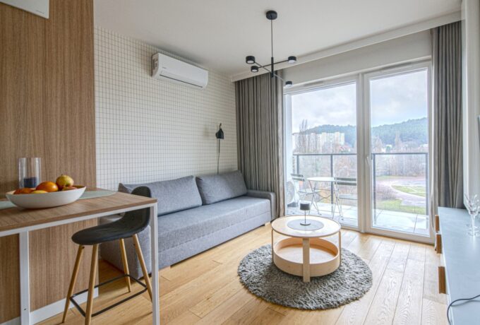 Mieszkanie o całkowitej powierzchni 42 m2 składa się z pokoju dziennego z aneksem kuchennym z wyjściem na balkon, sypialni, łazienki i przedpokoju. Pokój dzienny wyposażony w szeroką i wygodną kanapę, stolik kawowy i telewizor. Aneks kuchenny z praktyczną, nowoczesną zabudową w modnej kolorystyce oraz wyposażony w nowoczesny sprzęt AGD. Jasna, otwarta kuchnia daje uczucie przestrzeni. Sypialnia posiada duże, wygodne łóżko oraz solidną szafę z lustrami. Łazienka w biało czarnej tonacji z wygodnym prysznicem i umywalką.