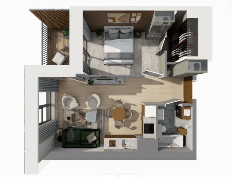 – pokój dzienny z aneksem kuchennym (21,73m2),