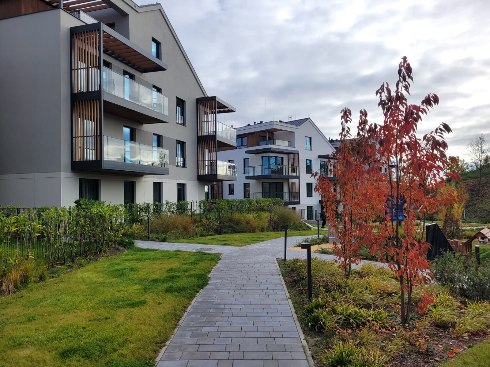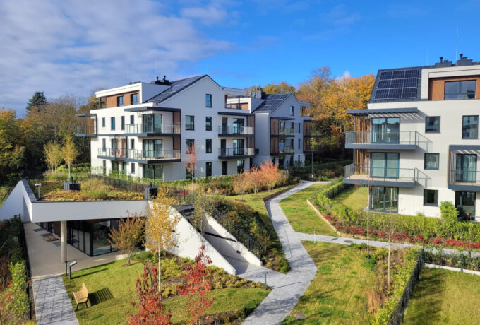 – elegancka, spójna architektura z zielonymi dachami i stonowanymi elewacjami