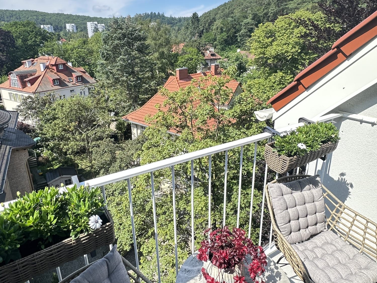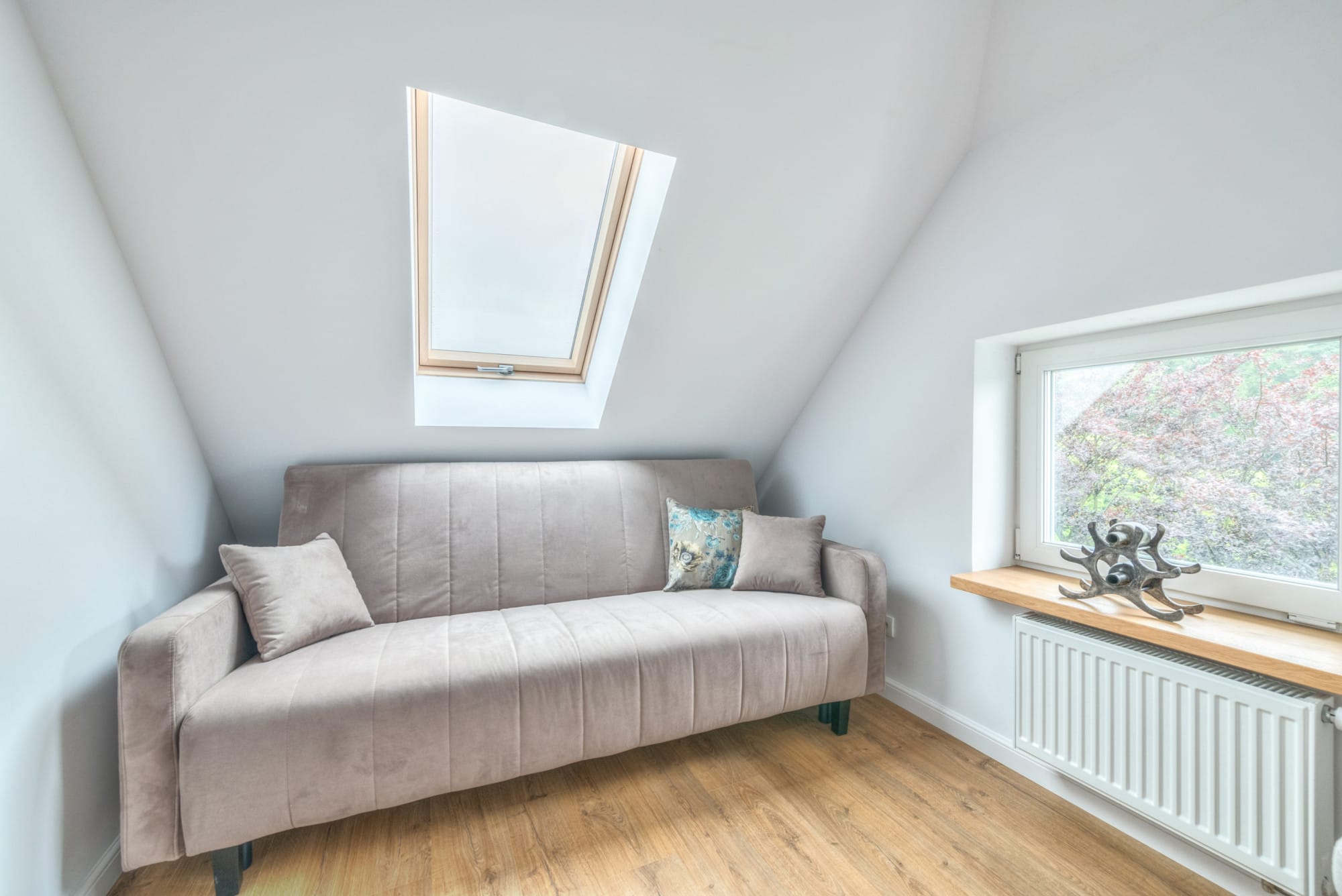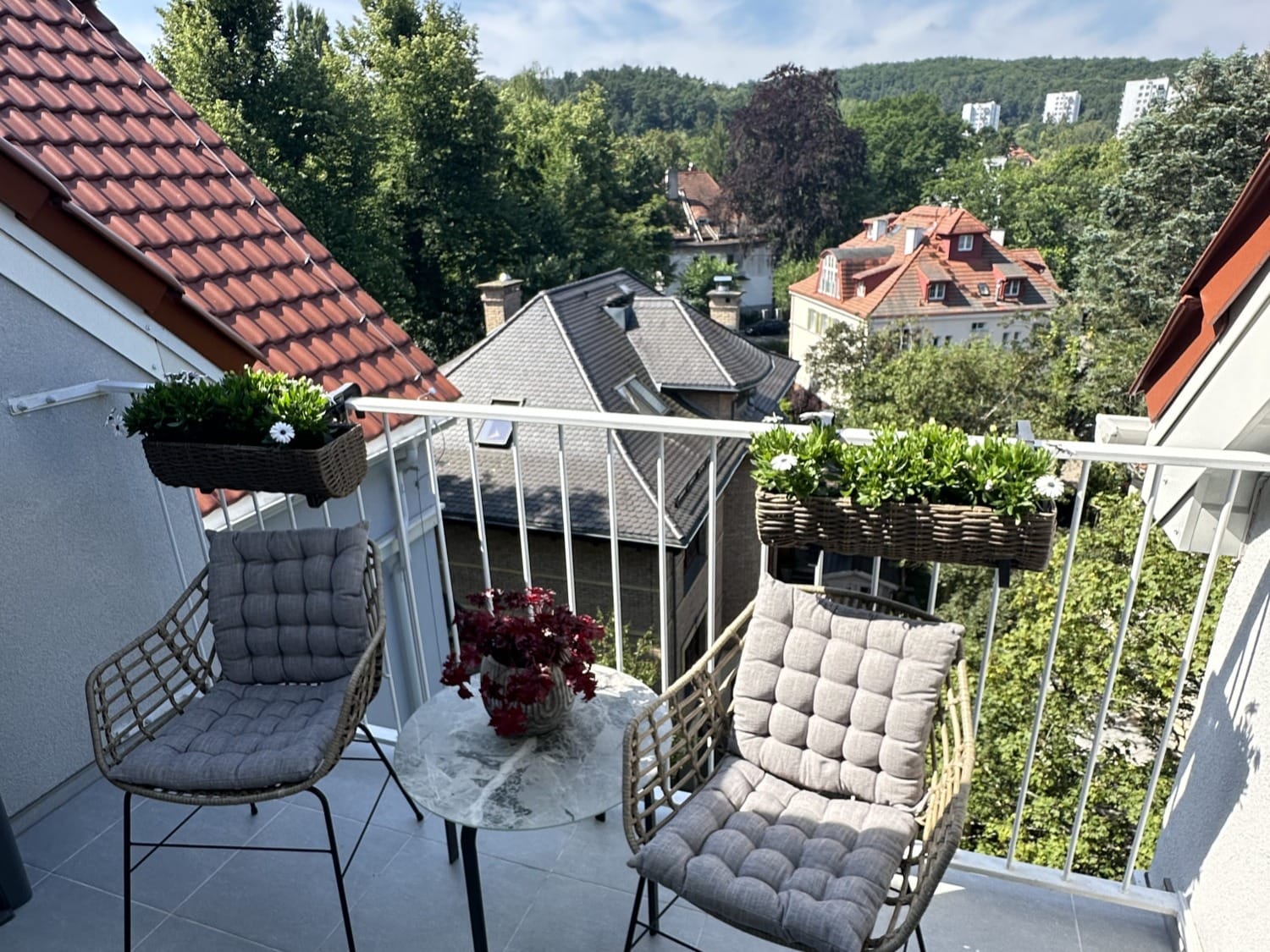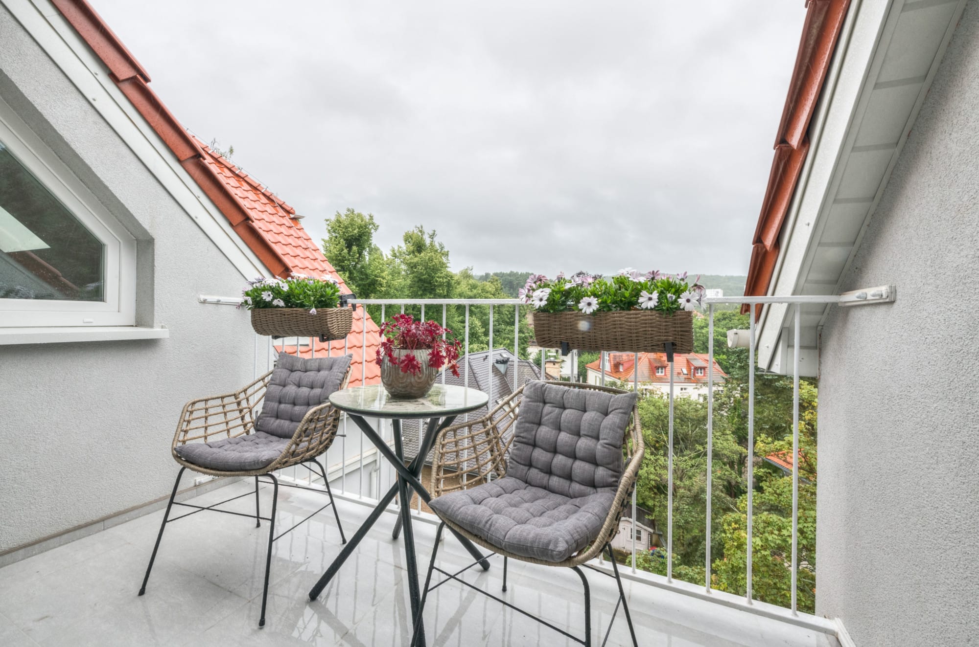 – pokój – elegancka strefa dzienna z wyjściem na taras, z którego rozciąga się piękny widok ponad dachami domów sopockich