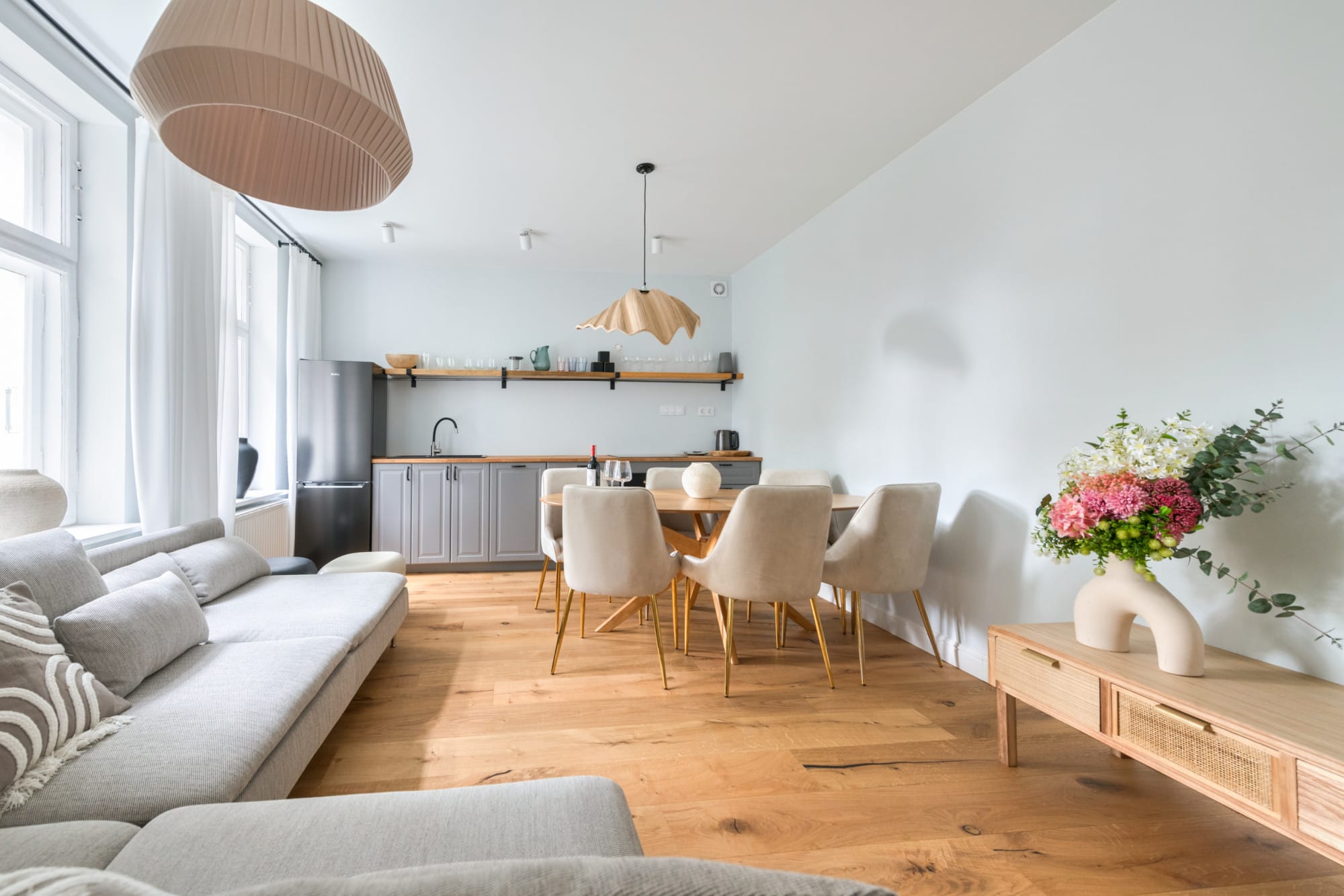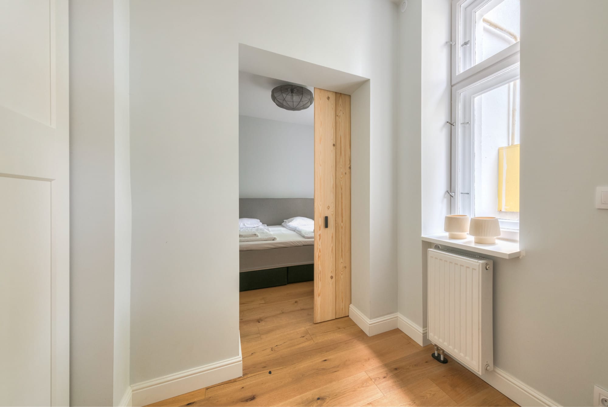 Mieszkanie parterowe, mieszczące się w kamienicy z 1896 roku, złożone jest z 2 sypialni i dużego salonu z aneksem kuchennym i drewnianej werandy z wyjściem na ogródek. Ekspozycja na 4 strony świata pozwala cieszyć się słońcem przez cały dzień.