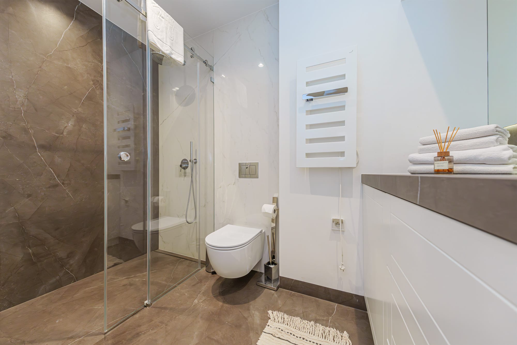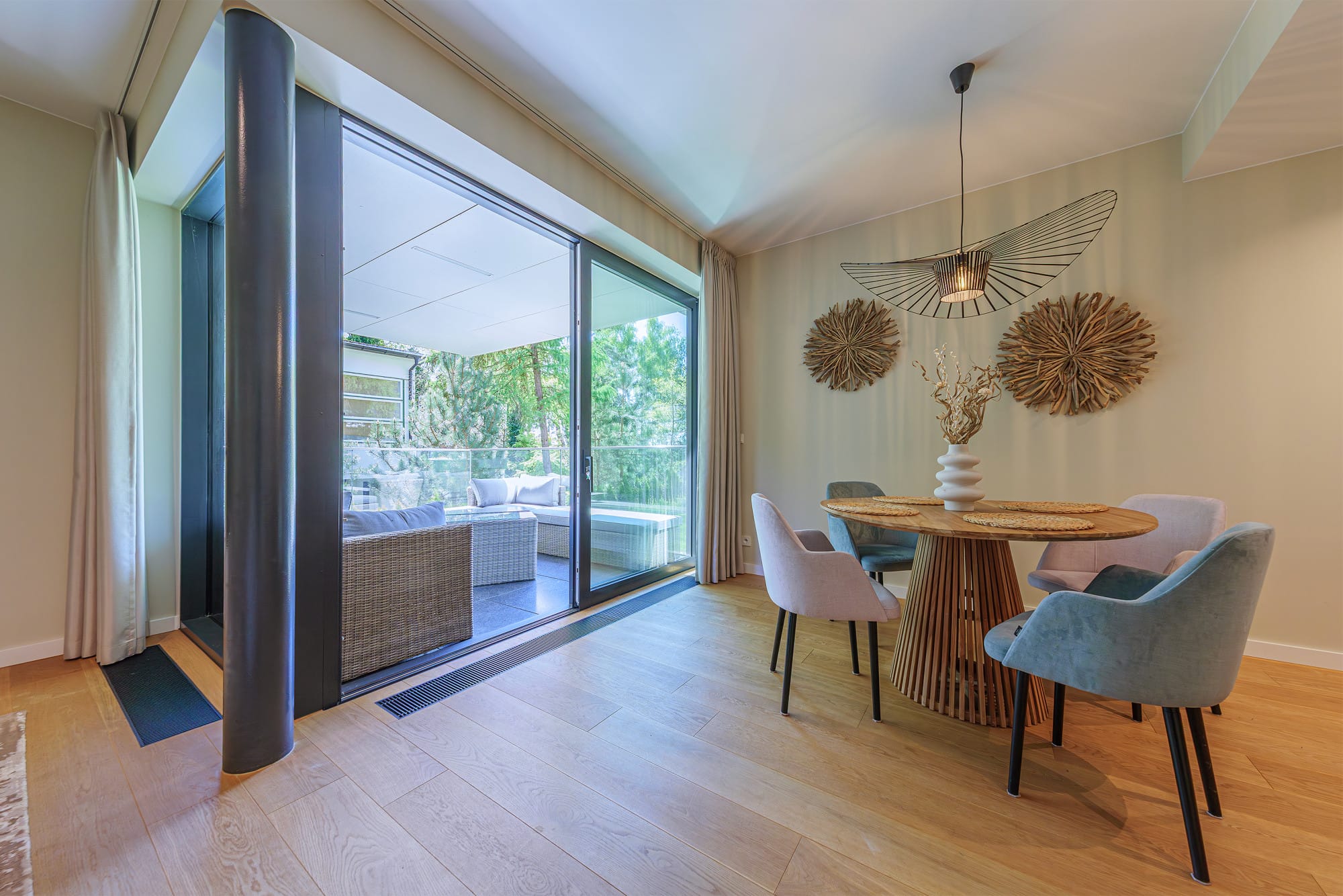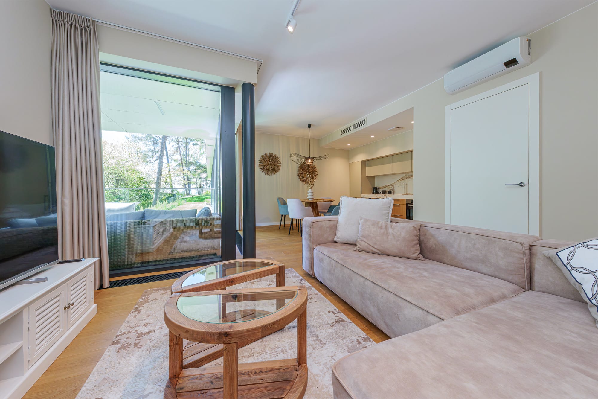 urządzony tak aby zadowolić najbardziej wymagających. Lokal składa się z salonu za aneksem kuchennym, dwóch sypialni, łazienki, WC, pomieszczenia gospodarczego. Apartament jest klimatyzowany, został wykończony z użyciem wysokiej jakości materiałów: podłogi drewniane, kuchnia wyposażona w sprzęty niemieckiej renomowanej firmy Miele, blaty ze spieków, fronty fornirowane w kolorze dębowym, łazienki w wysokiej jakości gresie. Apartament posiada przestronny taras o powierzchni 23 m2, salon urządzony jest w minimalistycznym stylu, wyposażony w wygodny narożnik. Sypialnia jest utrzymana w jasnych tonach, z przytulnym łóżkiem i klasycznymi szafkami nocnymi. Do apartamentu przynależy miejsce w hali garażowej i komóra lokatorska dodatkowo płatane 150.000 zł netto. Podana cena jest cena netto należy doliczyć podatek 23 VAT.Pomieszczenia