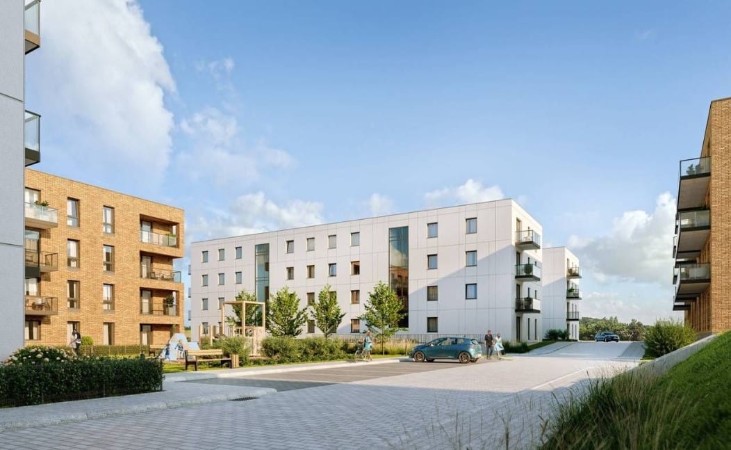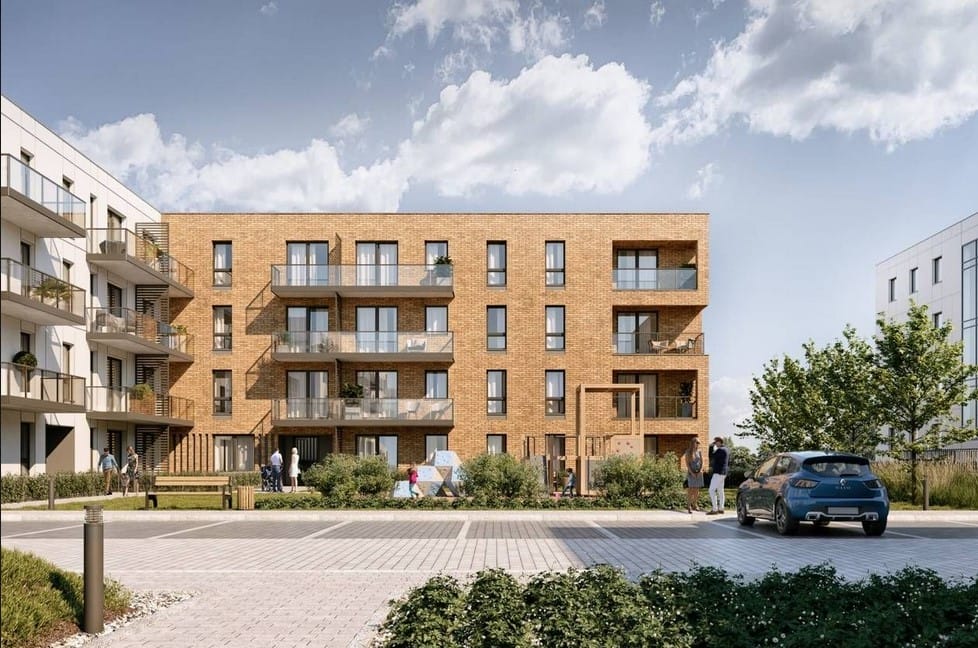Prosta bryła budynków w jasnej elewacji z okładziną ceglaną, z przestronnymi klatkami schodowymi i cichobieżnymi windami. Dla mieszkańców miejsca postojowe naziemne oraz podziemne, dla najmłodszych plac zabaw.