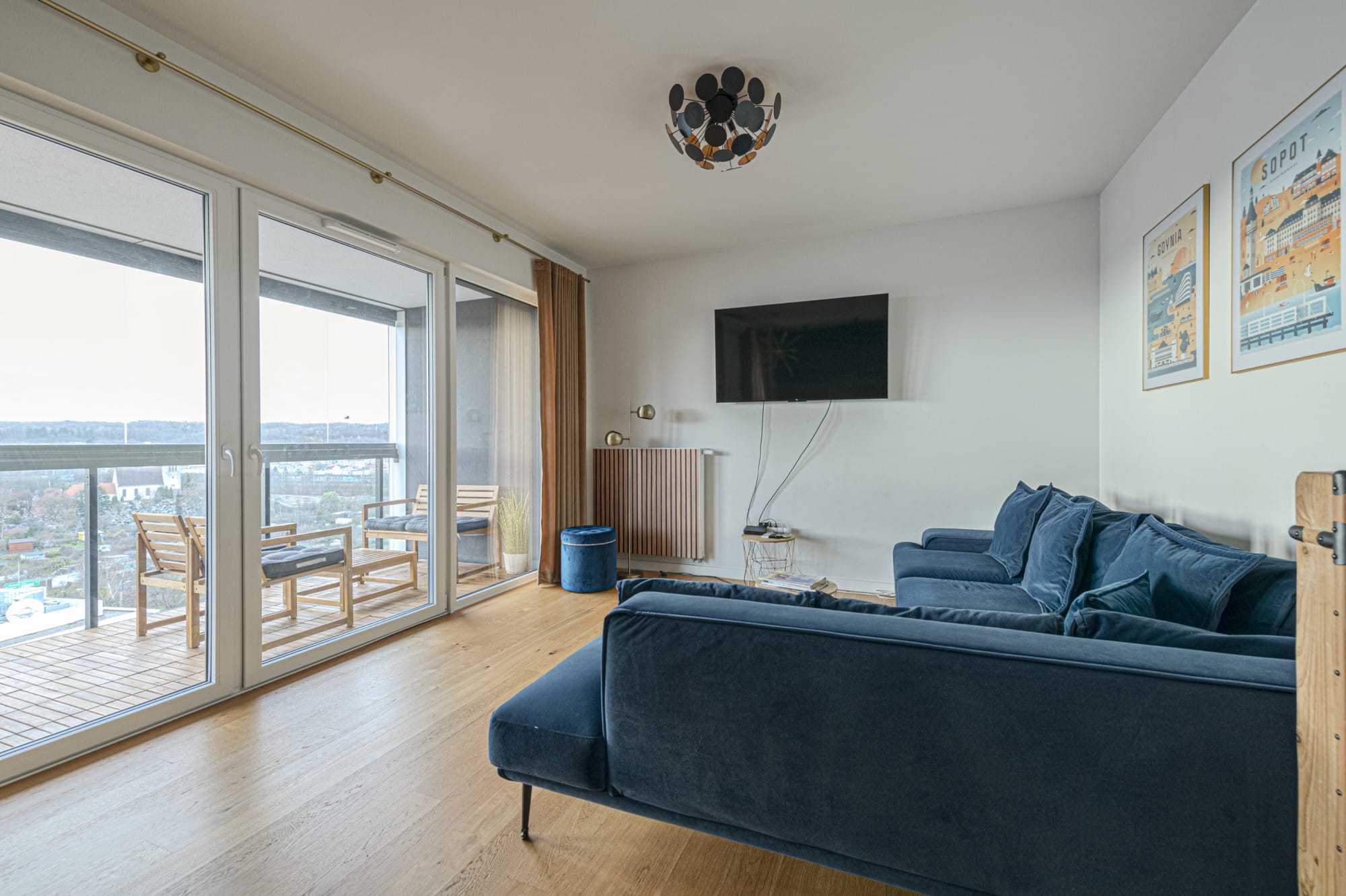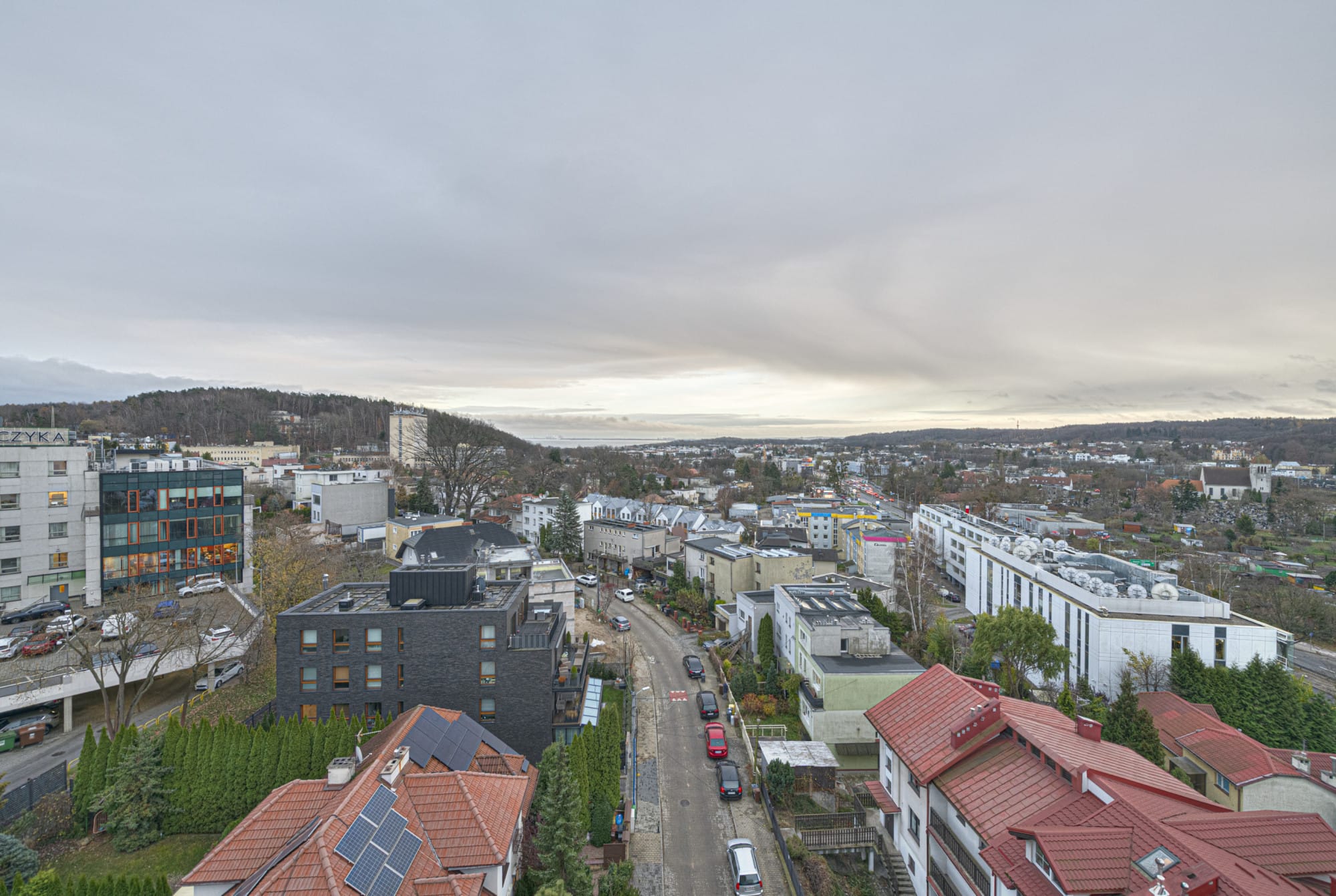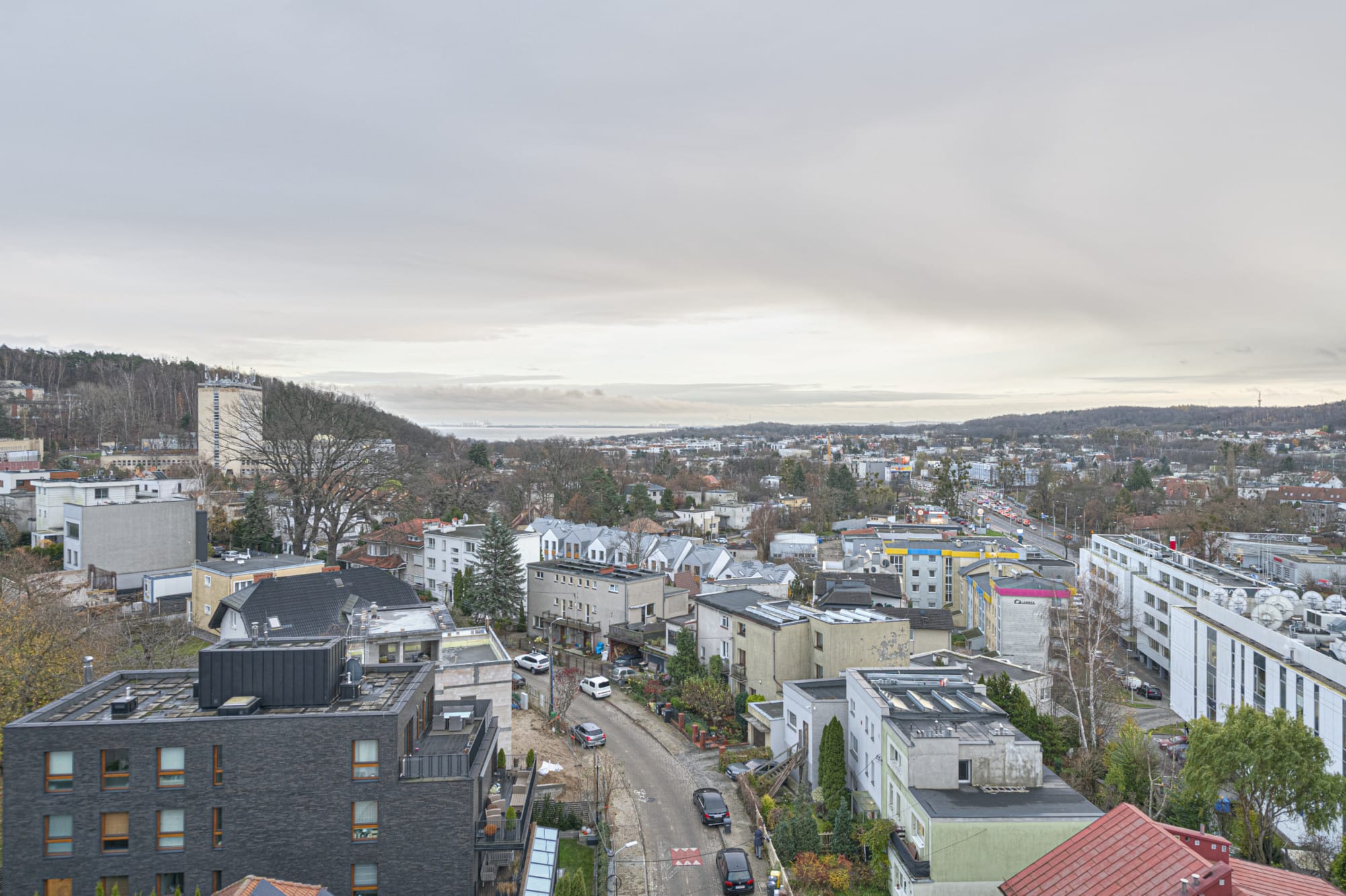 Przestronny apartament z pełnym widokiem na panoramę Gdyni i morze oraz rezerwat przyrody Kępa Redłowska.