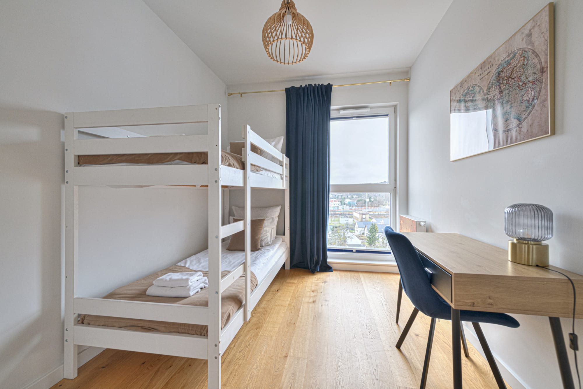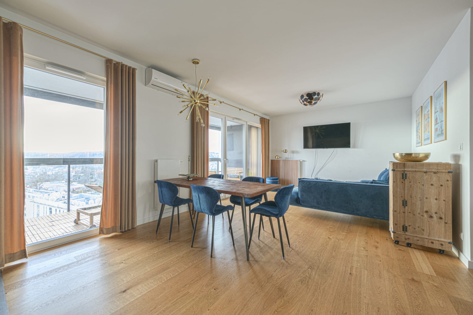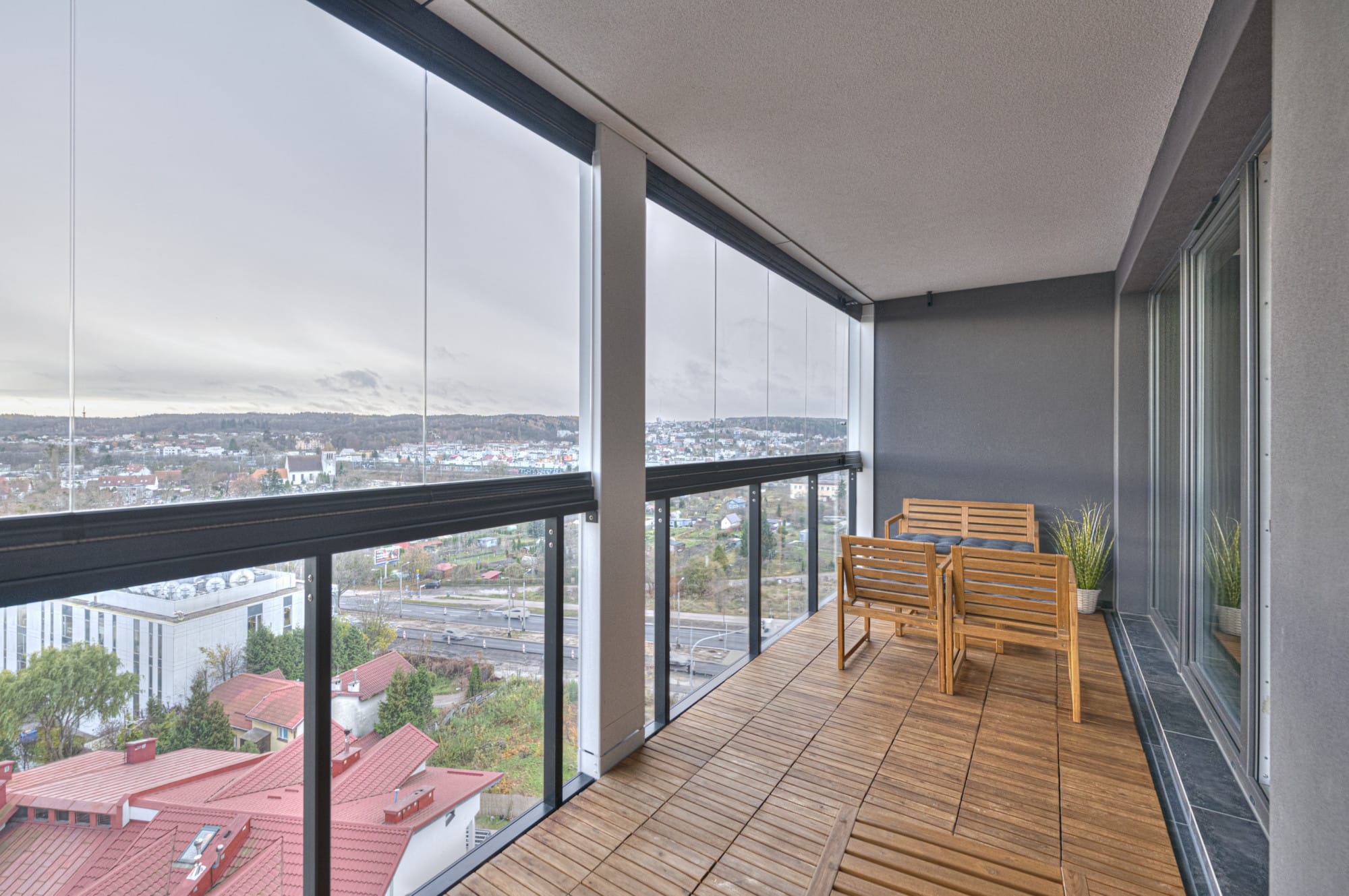 Przestronny apartament z pełnym widokiem na panoramę Gdyni i morze oraz rezerwat przyrody Kępa Redłowska.