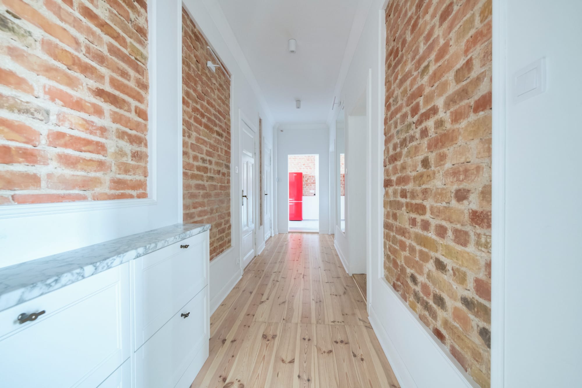 Mieszkanie o powierzchni 88 m2, składa się z dużego salonu z wyjściem na balkon, oddzielnej, jasnej kuchni, trzech pokoi, dwóch łazienek (jedna z natryskiem, druga z wanną), oraz korytarza. We wnętrzach zachowano oryginalne drewniane drzwi i klamki. W wielu miejscach odsłonięto i oczyszczono cegły. Do lokalu przynależy zewnętrzne miejsce postojowe oraz piwnica.
