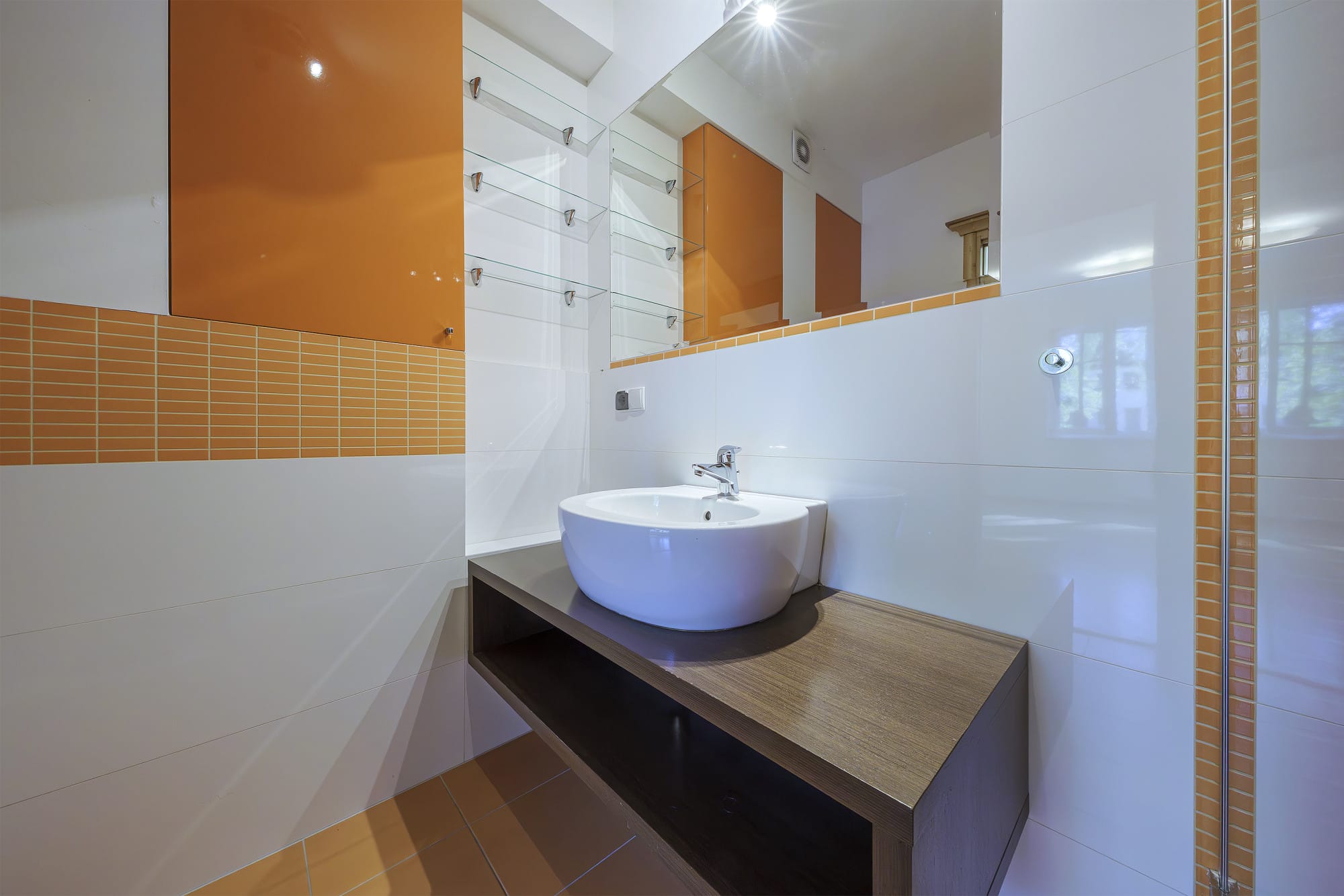 W mieszkaniu wydzielono przestronny salon o powierzchni ok. 50 m2, oddzielną kuchnię z jadalnią (18 m2), trzy sypialnie oraz dwie łazienki i wc. W kuchni pełne wyposażenie: zabudowa meblowa, lodówka z zamrażarką, piekarnik, płyta ceramiczna, zmywarka, dodatkowe ogrzewanie podłogowe. W jednej z łazienek wanna, pralka, bidet, w drugiej kabina prysznicowa. W korytarzu pojemna szafa w zabudowie. Od strony południowo-wschodniej taras. Stolarka okienna wykonana z drewna mahoniowego malowanego na biało, drzwi antywłamaniowe, wideodomofon. Apartament świeżo odnowiony (odmalowane wszystkie ściany, nowe sprzęty AGD, wymienione fronty w kuchni).