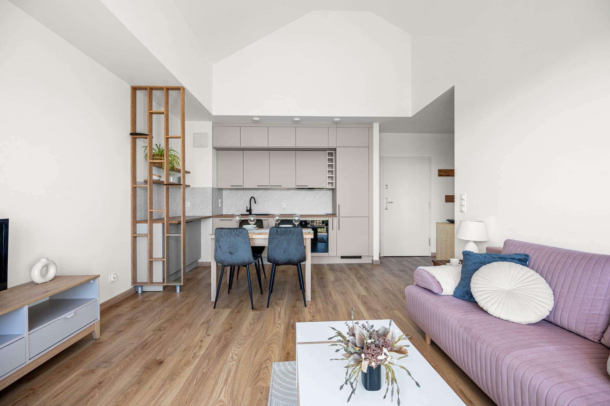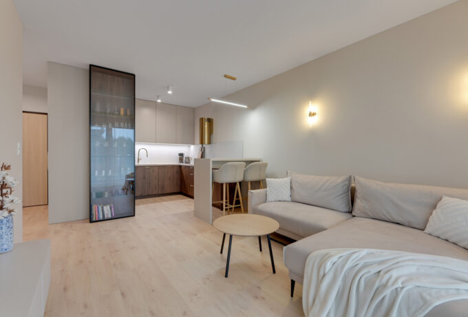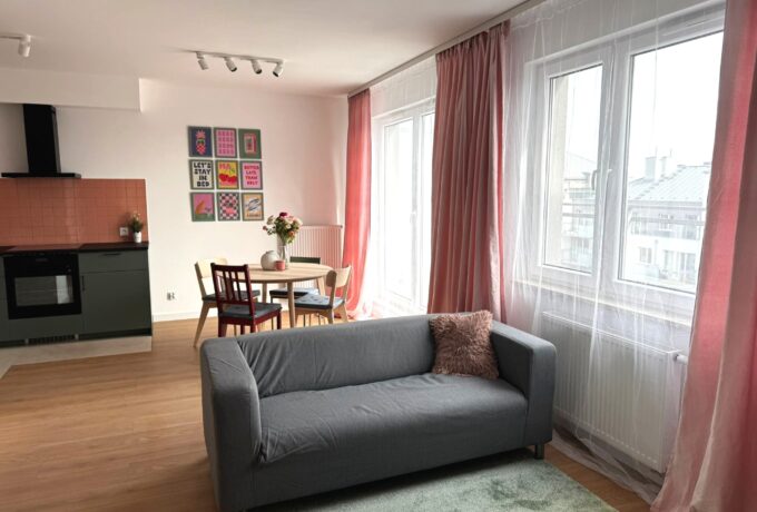 Mieszkanie zostało wykończone i urządzone w jasnych, stonowanych kolorach, co nadaje wnętrzu przytulny i nowoczesny charakter. Dodatkowym atutem strefy dziennej jest ponadstandardowa wysokość pomieszczenia, która daje poczucie większej przestrzeni. Aneks kuchenny wyposażono w niezbędny sprzęt AGD, a całe mieszkanie jest w pełni umeblowane i gotowe do zamieszkania.