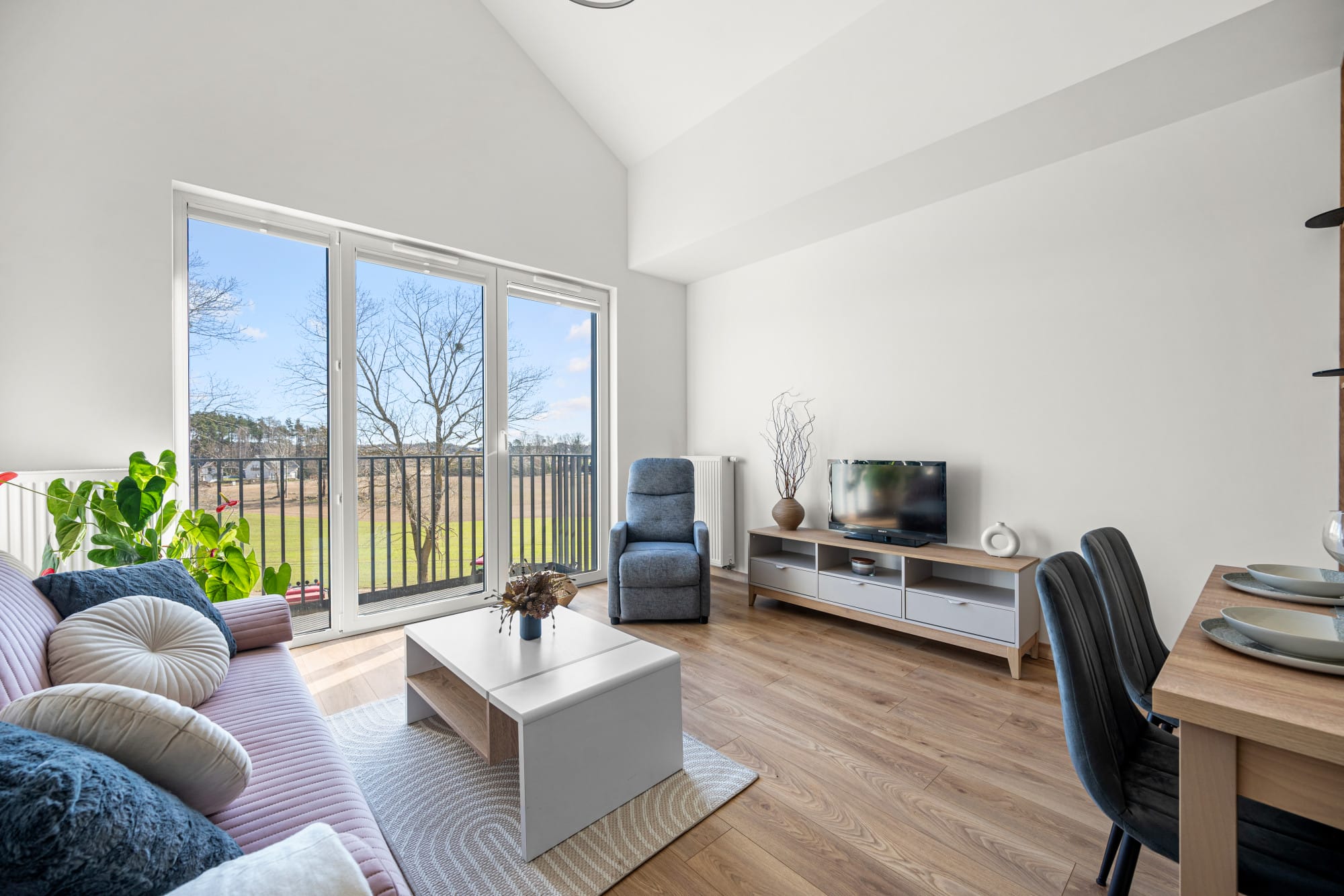 – pokój dzienny z aneksem kuchennym i wyjściem na duży balkon,