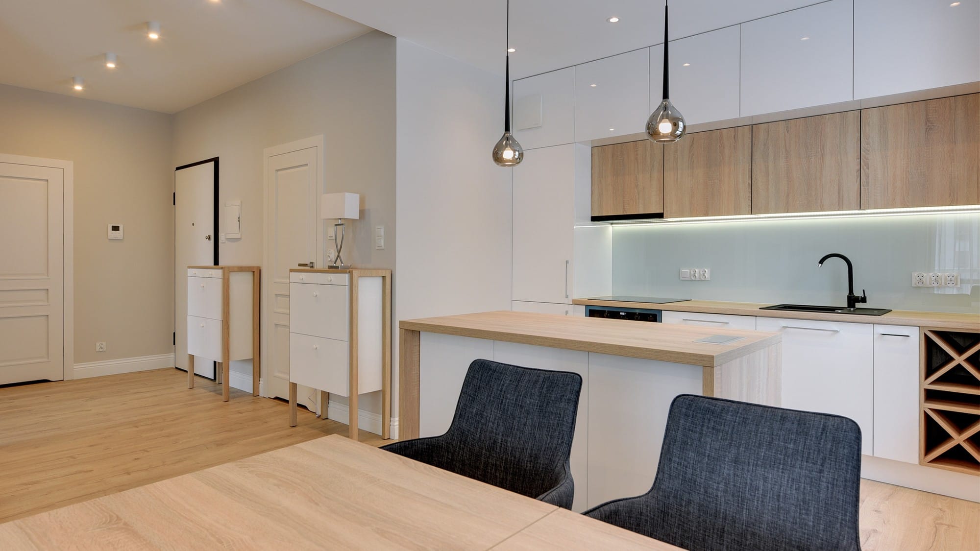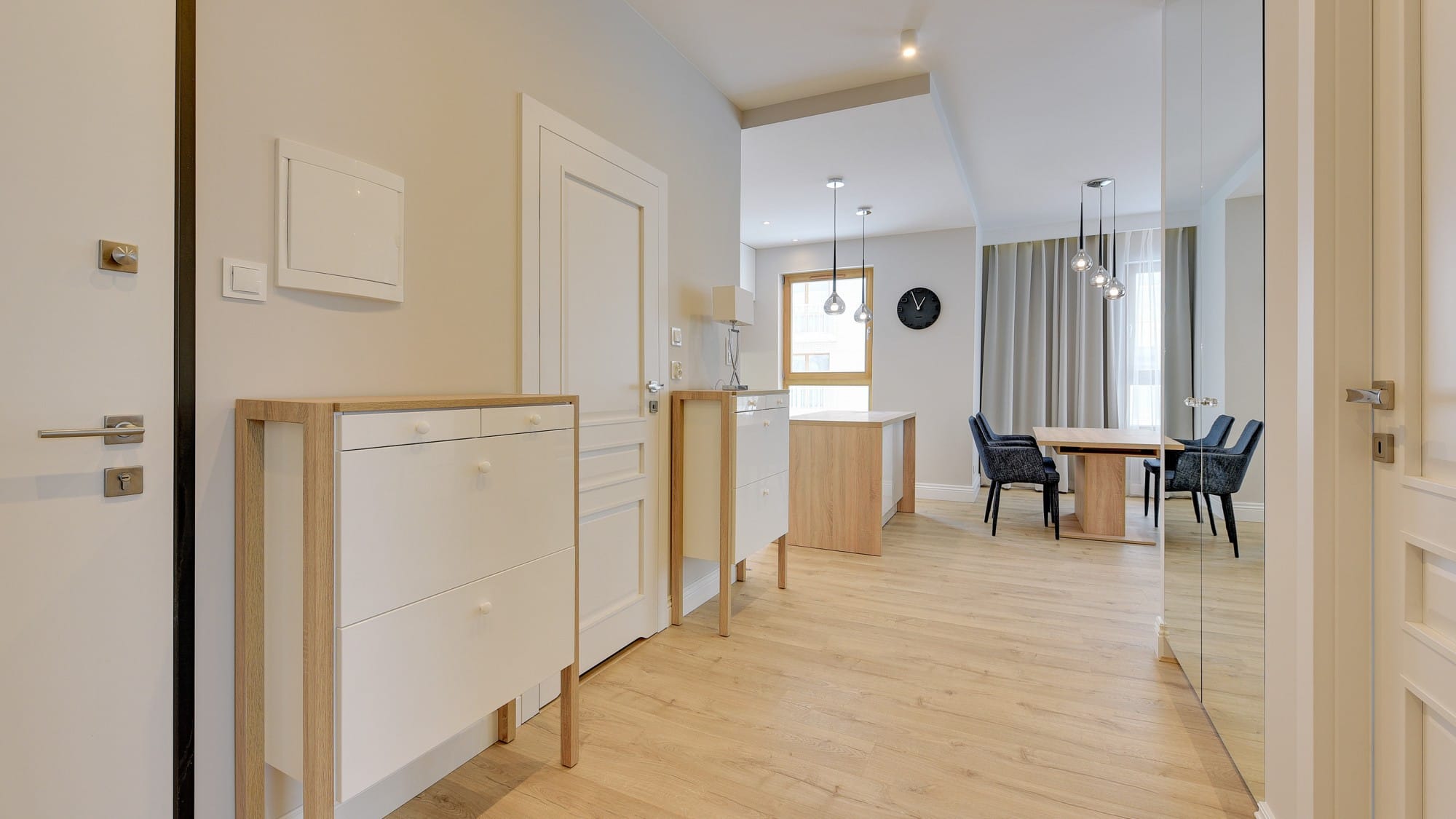 Mieszkanie nowe, starannie wykończone i urządzone wysokiej jakości materiałami, wnętrze w ponadczasowej jasnej kolorystyce z elementami drewna, funkcjonalne i przemyślane.