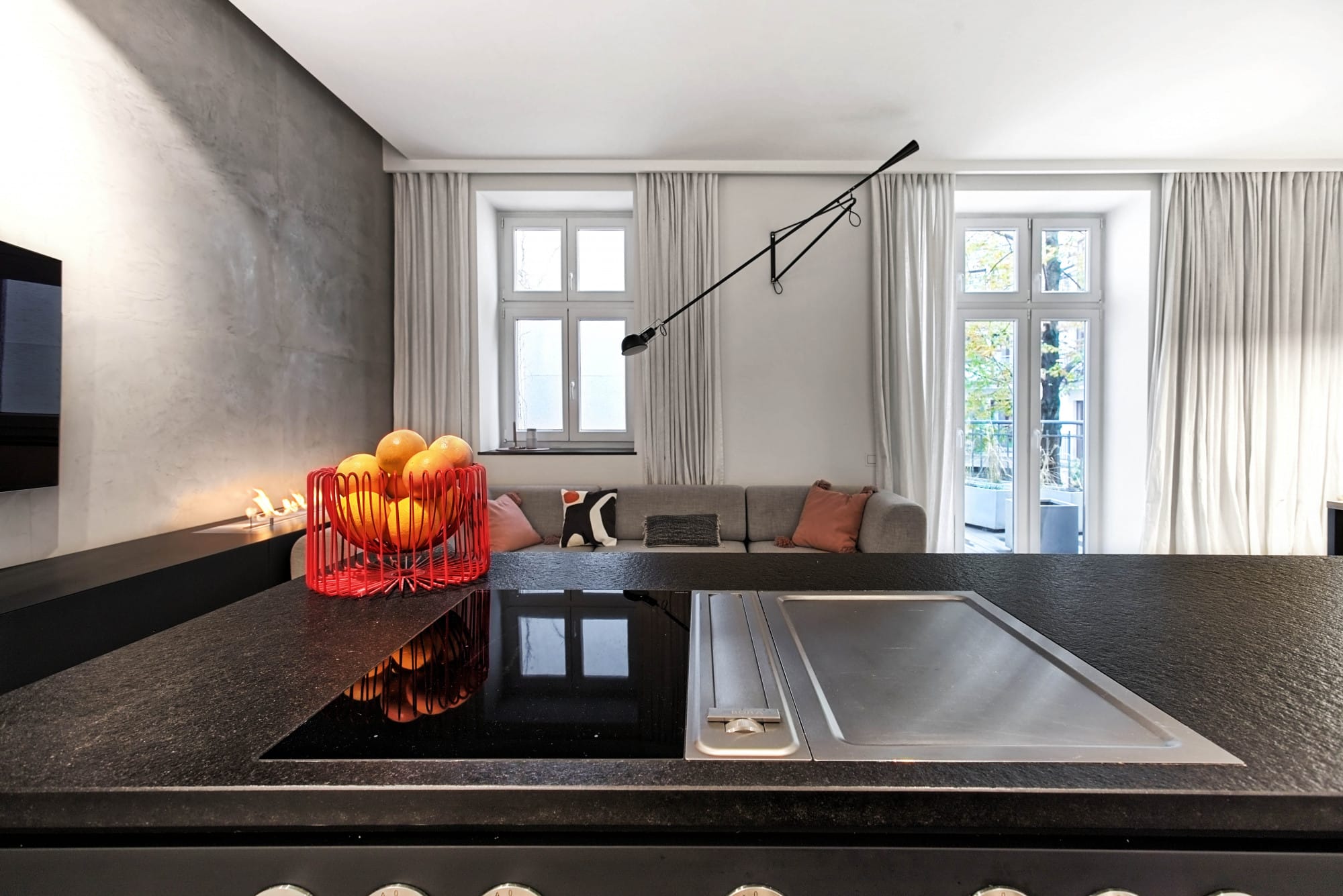 – Niezwykle praktyczny aneks kuchenny z granitową wyspą o długości 292 cm wyposażony we wszystkie niezbędne sprzęty w eleganckiej, dyskretnej zabudowie